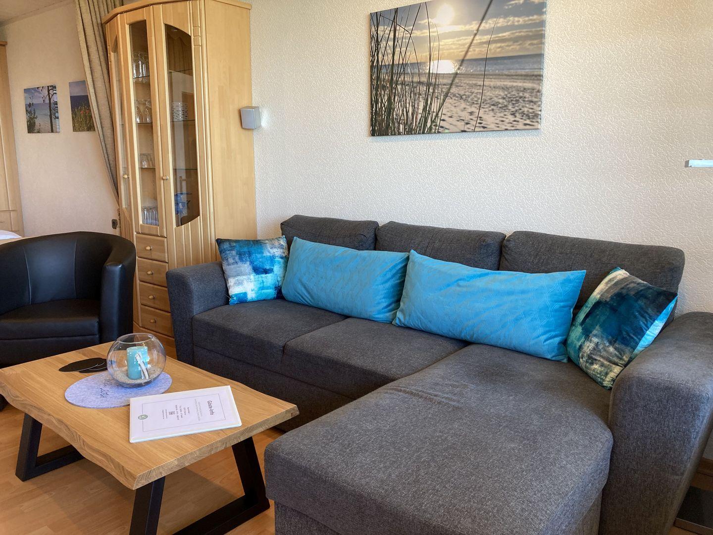 - Wohn-, Schlafzimmer mit gemütlichem Chaiselongue-Sofa, Sessel und TV