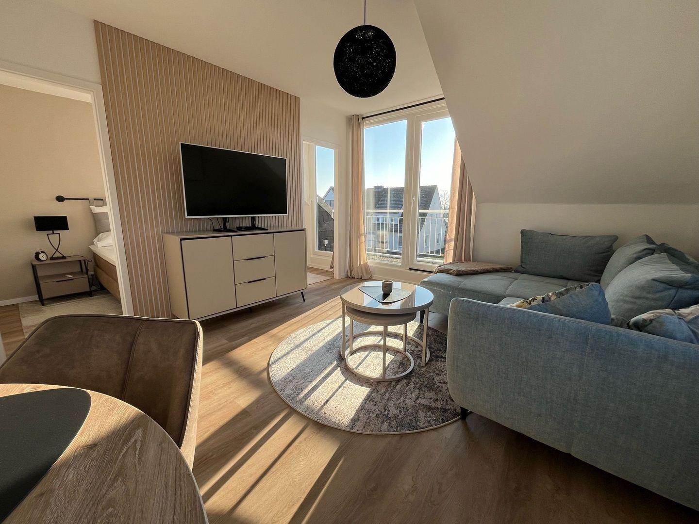 - Wohnzimmer mit gemütlicher Sofaecke und TV,