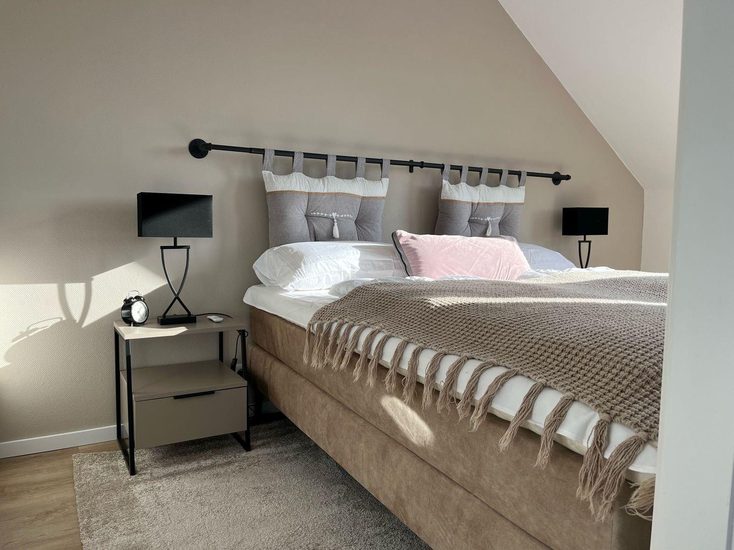 - Schlafzimmer mit Boxspringbett (durchgängige Matratze) und großem Einbauschrank
