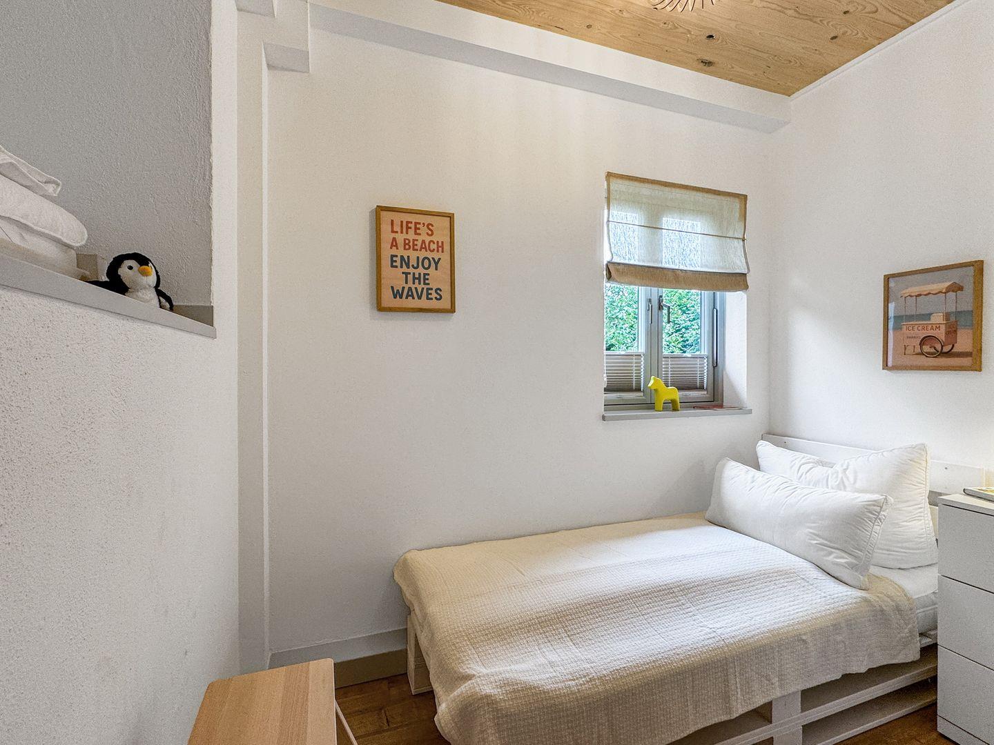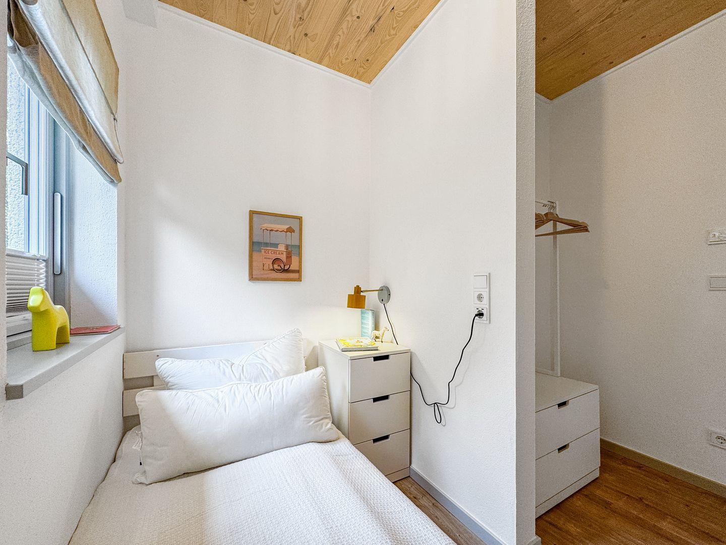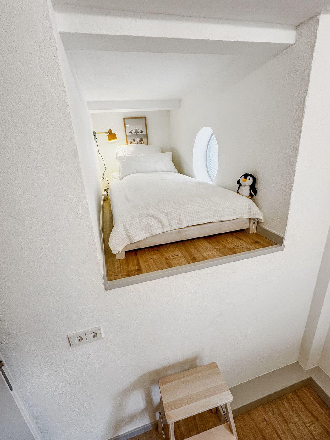 Die Besonderheit: Im Kinderzimmer steht ein normales Bett sowie ein weiteres Bett ( 90 x 200 cm mit Lattenrost) in einem Alkoven, der über eine kleine Leiter erreichbar ist. Das Bett eignet sich daher für größere Kinder und Jugendliche.