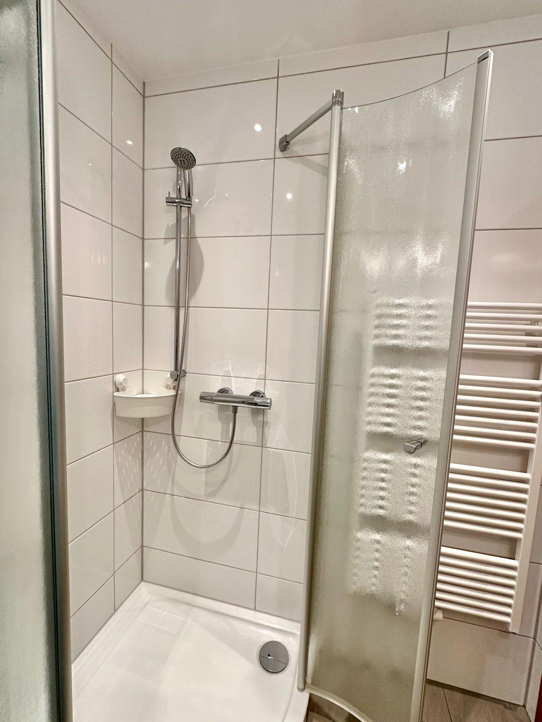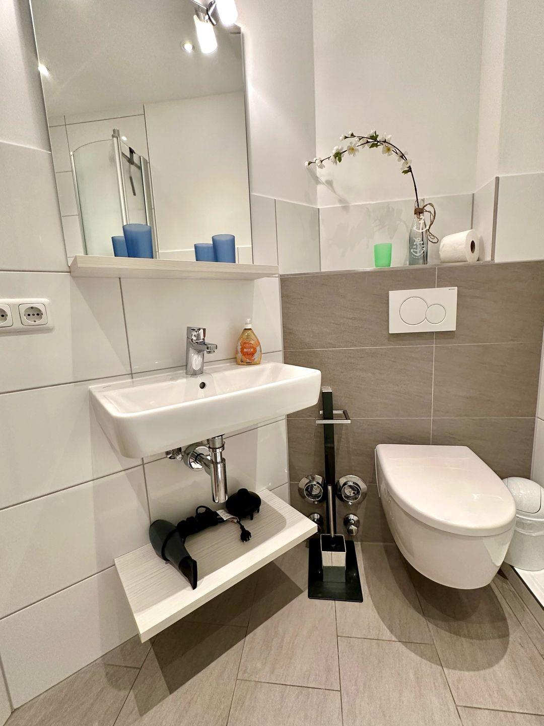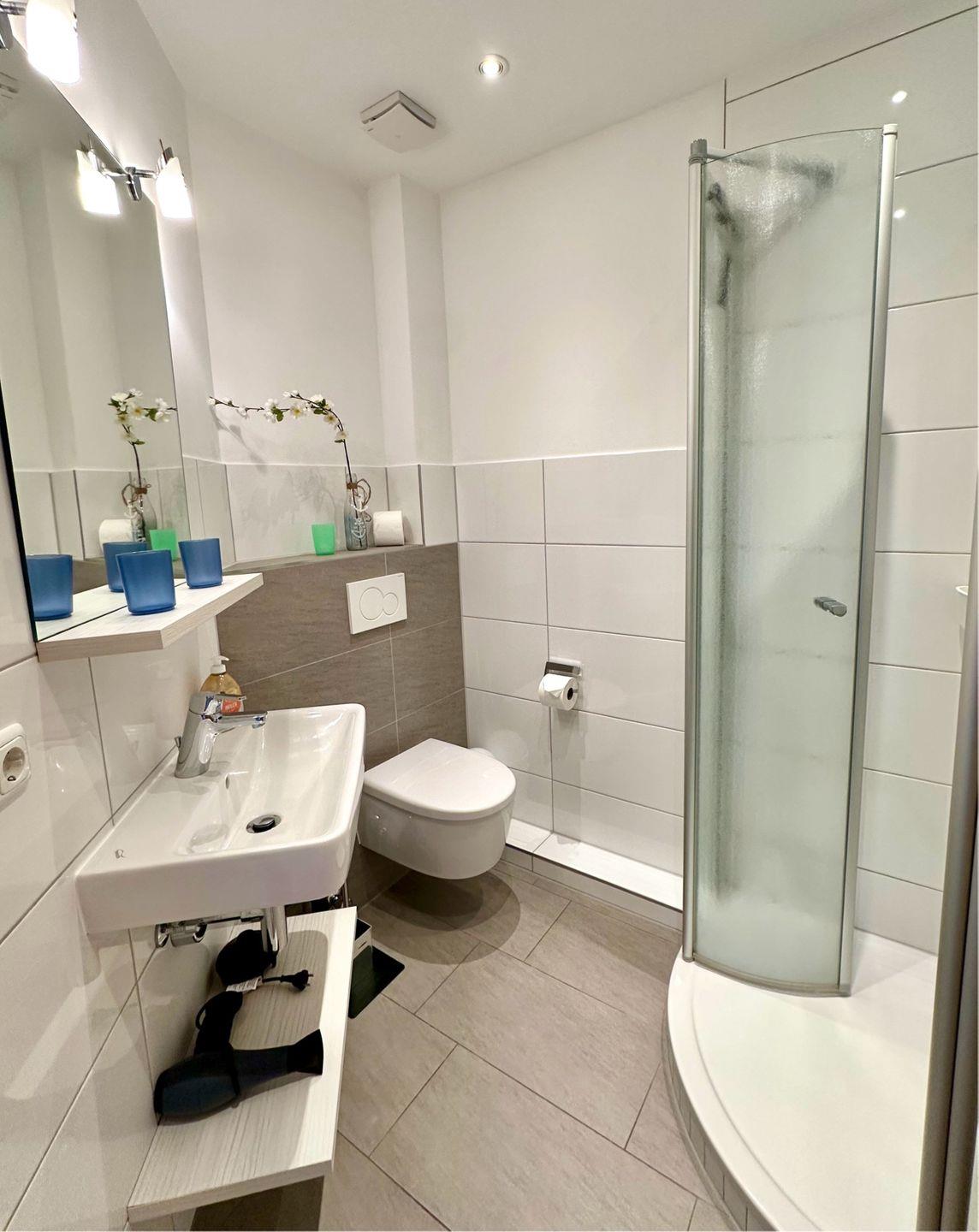 Das Badezimmer ist modern eingerichtet und bietet Ihnen eine Dusche sowie ein WC.