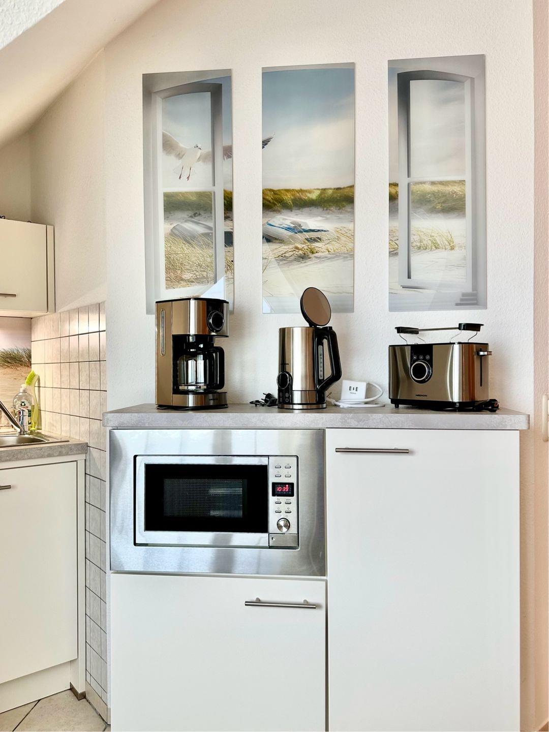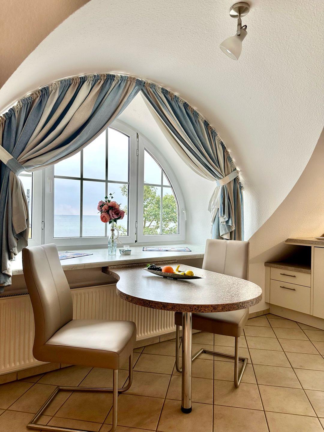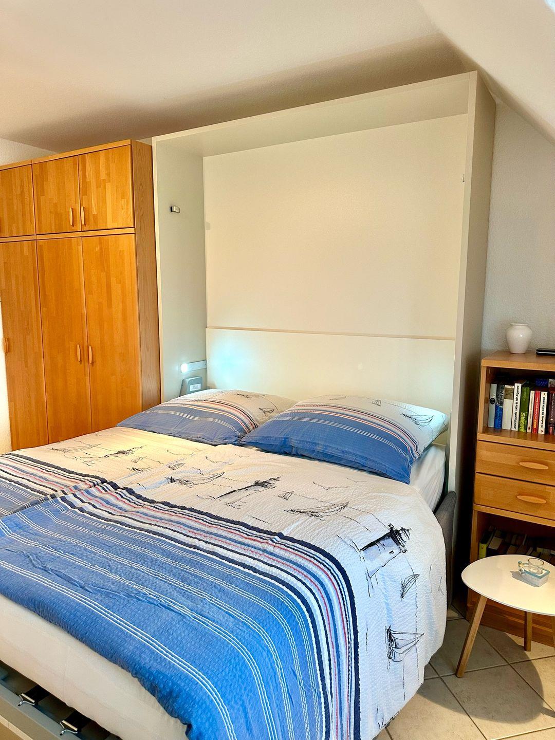 Der Wohn-Schlafraum ist mit einem Wandklappbett ausgestattet. Das Sofa wird somit in kürzester Zeit zum bequemen Doppelbett ausgeklappt. Durch die großen Fenster hat man einen herrlichen Panoramablick auf die Ostsee und an klaren Tagen reicht die Sicht sogar bis zur Insel Fehmarn. In der integrierten, modernen Pantryküche können Sie alle Mahlzeit selber zubereiten.