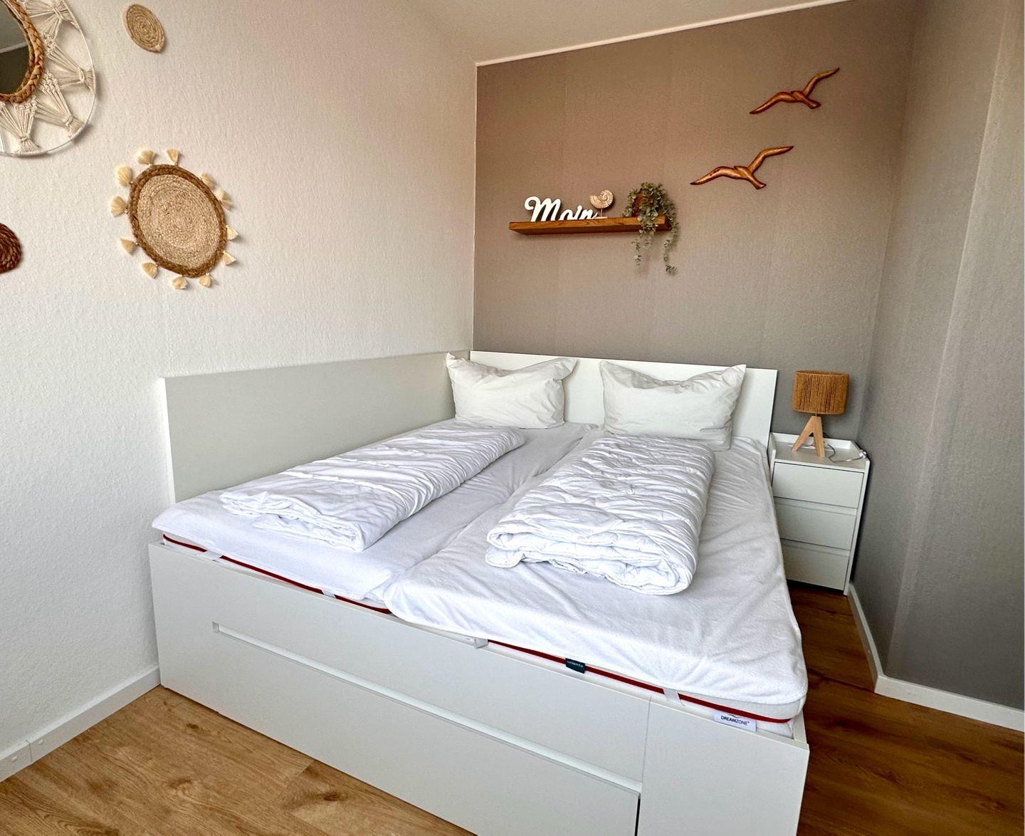 Im separaten Schlafzimmer erwartet Sie ein Doppelbett (2 x 90x200 cm). Hier finden Sie die Ruhe, die Sie nach einem erlebnisreichen Tag am Meer brauchen. Die geschickte Raumaufteilung macht die Wohnung sowohl für Paare als auch für Familien oder Freunde besonders flexibel.