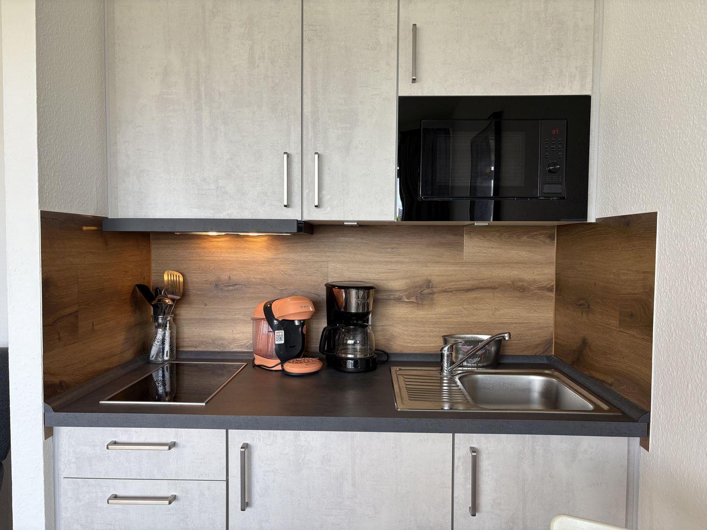 - im Wohnbereich integrierte Pantryküche mit 2-Platten-Herd, Mikrowelle mit Grillfunktion