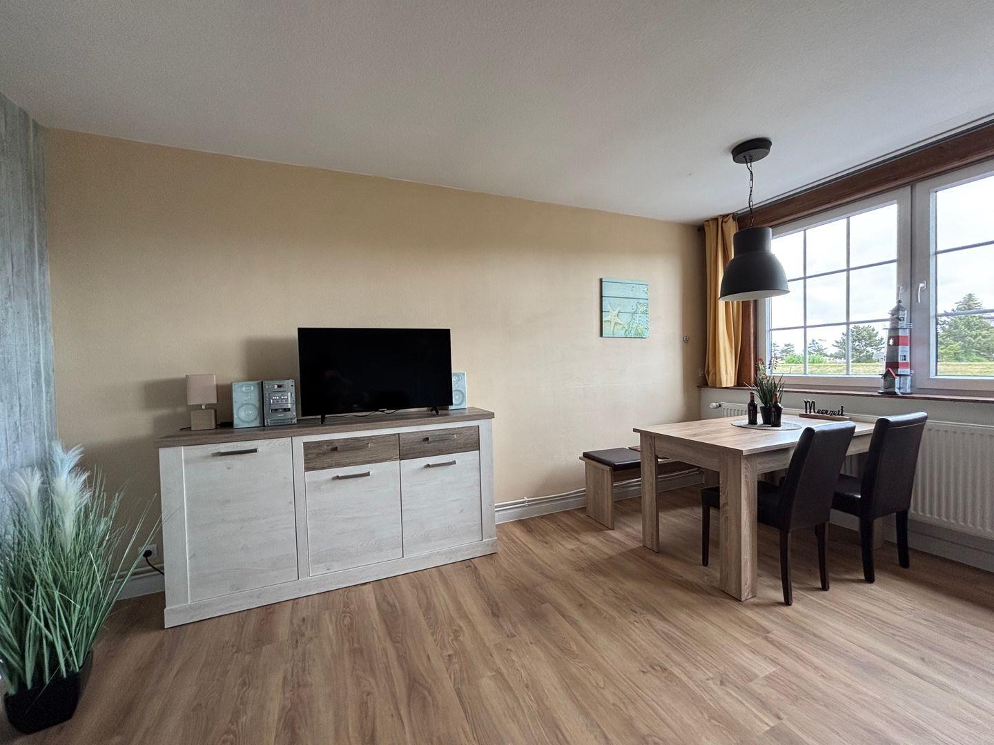 Einladender Wohn- Essbereich. Bequeme Couch. Fernseher. Radio. Entspannte Abende.