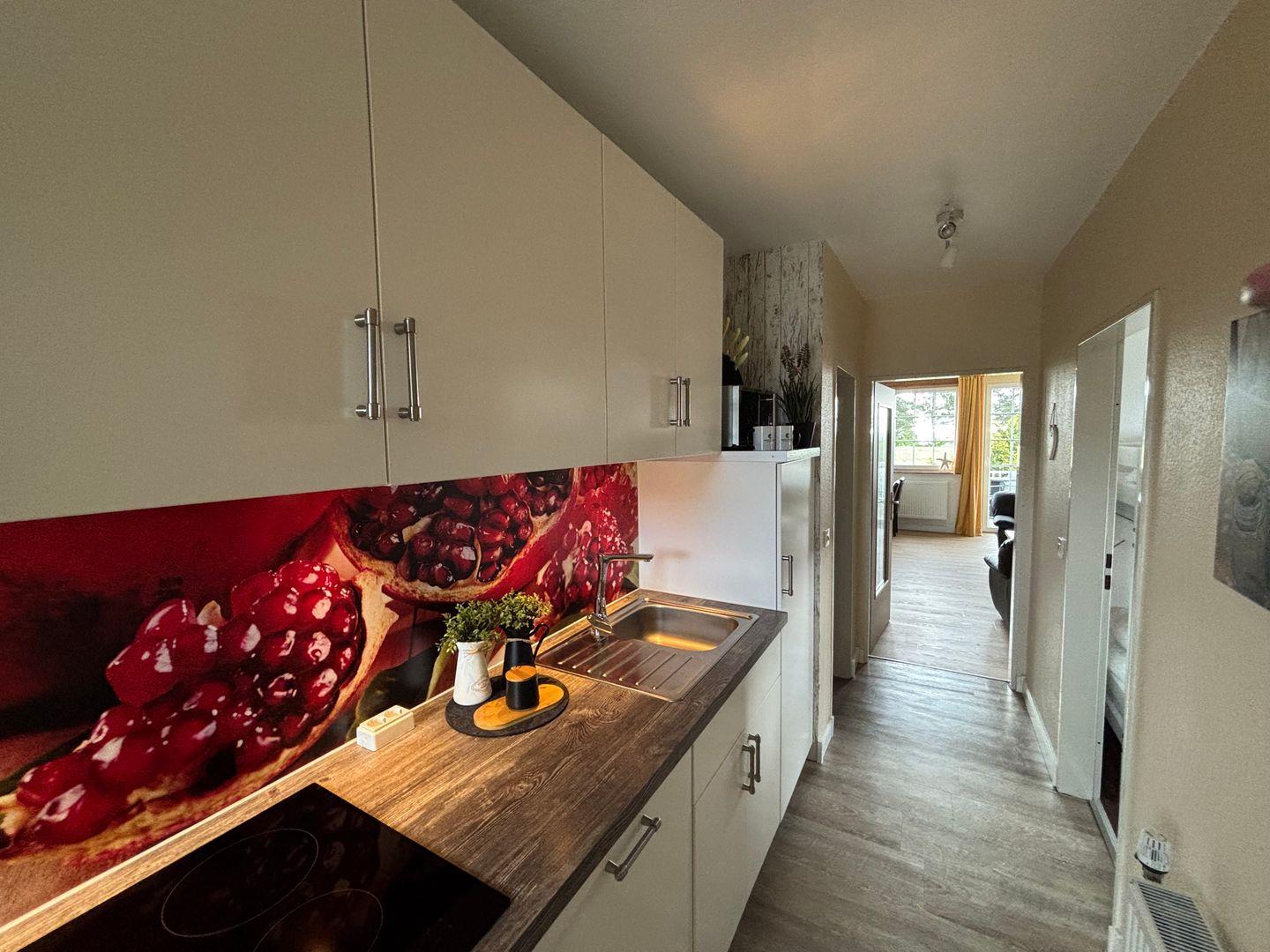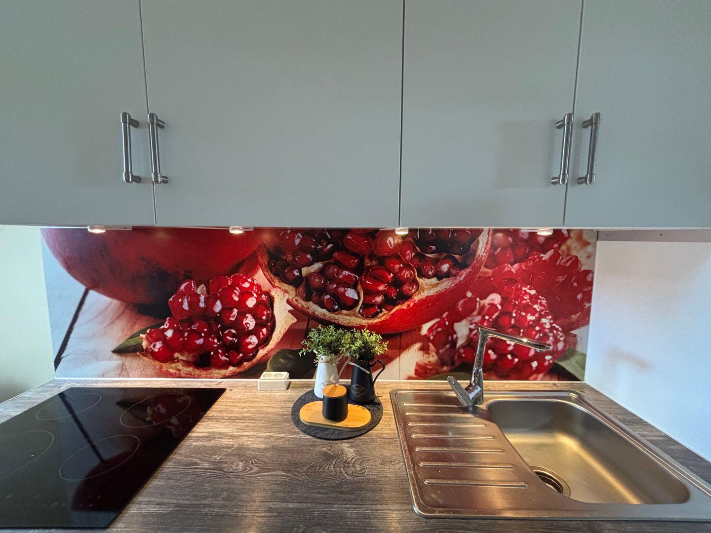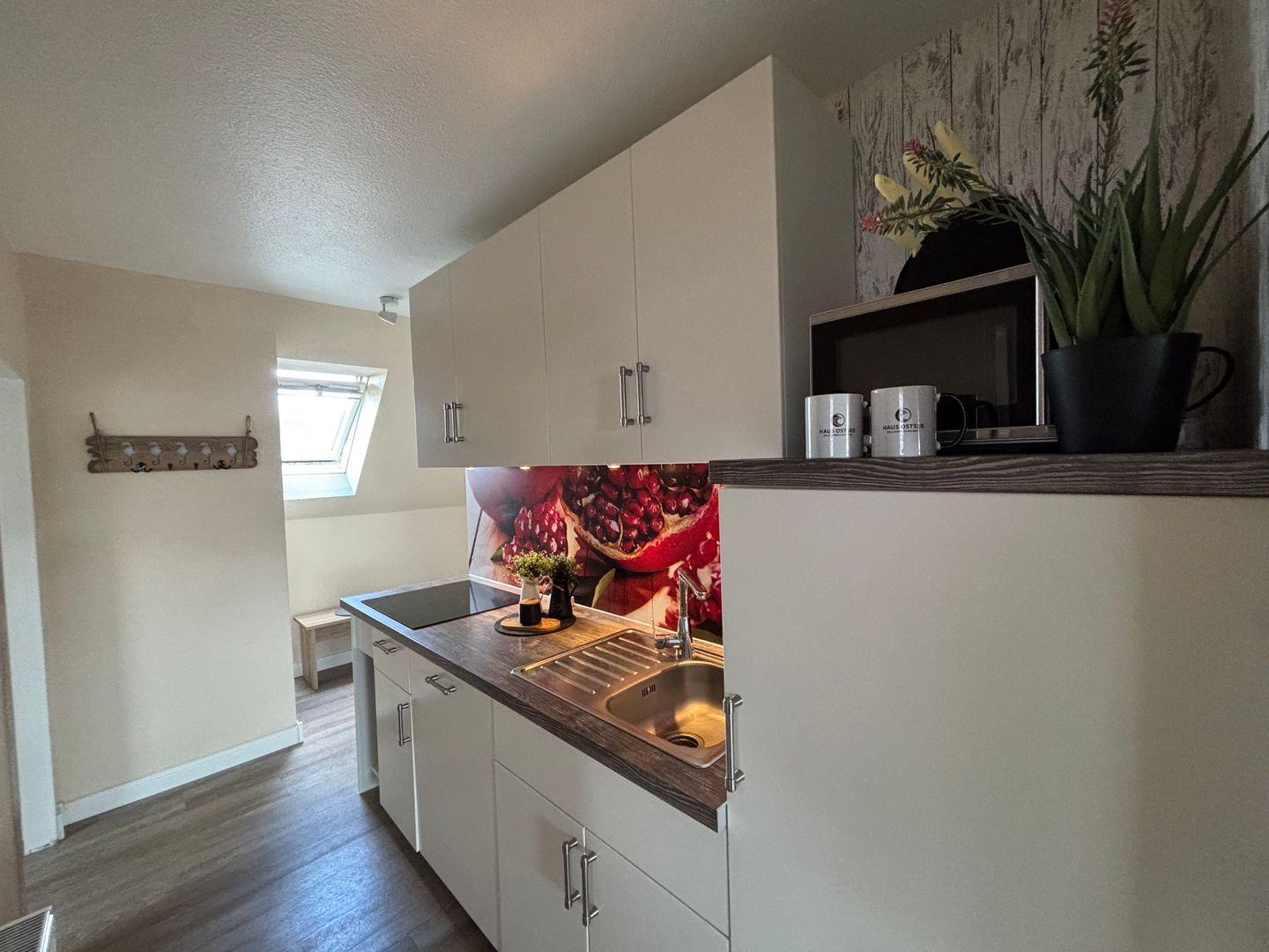 Ceranfeld mit 4 Kochzonen. Kaffeemaschine. Toaster. Eierkocher. Mikrowelle. Geschirrspüler.