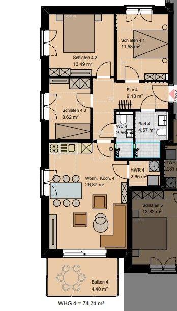 Die Ferienwohnung verfügt über insgesamt vier Zimmer, darunter drei separate Schlafzimmer, die Rückzugsorte für Familienmitglieder oder kleine Gruppen bieten. Für höchsten Komfort sorgen zwei moderne, bodengleiche Duschen in zwei Badezimmern. Die offene Küche geht direkt in den Wohnbereich über und ist mit einem Kühlschrank mit Gefrierfach, Backofen, Herd, Geschirrspüler, Kaffeemaschine, Wasserkocher und Toaster sowie Koch- und Essgeschirr voll ausgestattet. Ein gemütlicher Essbereich mit Esstisch lädt zum gemeinsamen Speisen ein.