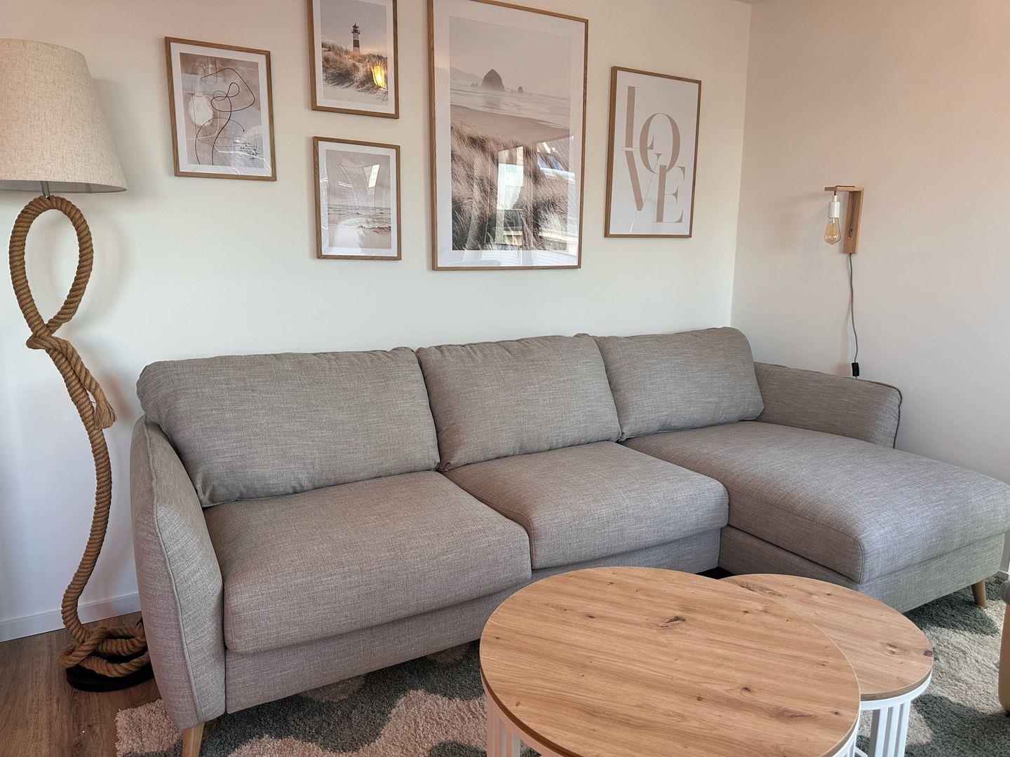Der helle, offene Wohnbereich mit gemütlicher Sofalandschaft und einladender Essecke bildet das stilvolle Herzstück der Wohnung. Hier lässt sich ein erlebnisreicher Strandtag bei einem Glas Wein, einem guten Buch oder einem gemeinsamen Spieleabend entspannt ausklingen.