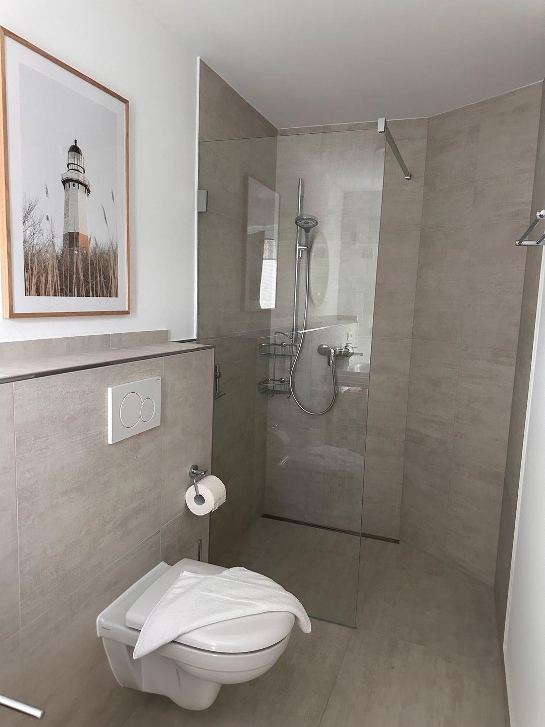 Ein separates Gäste-WC sowie zwei moderne Badezimmer mit bodengleichen Duschen – eines davon exklusiv vom Schlafzimmer aus zugänglich – sorgen für ein hohes Maß an Komfort und Privatsphäre, besonders für Familien oder reisende Paare, die Wert auf eigene Rückzugsbereiche legen.