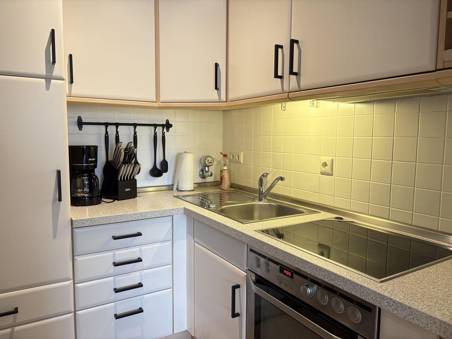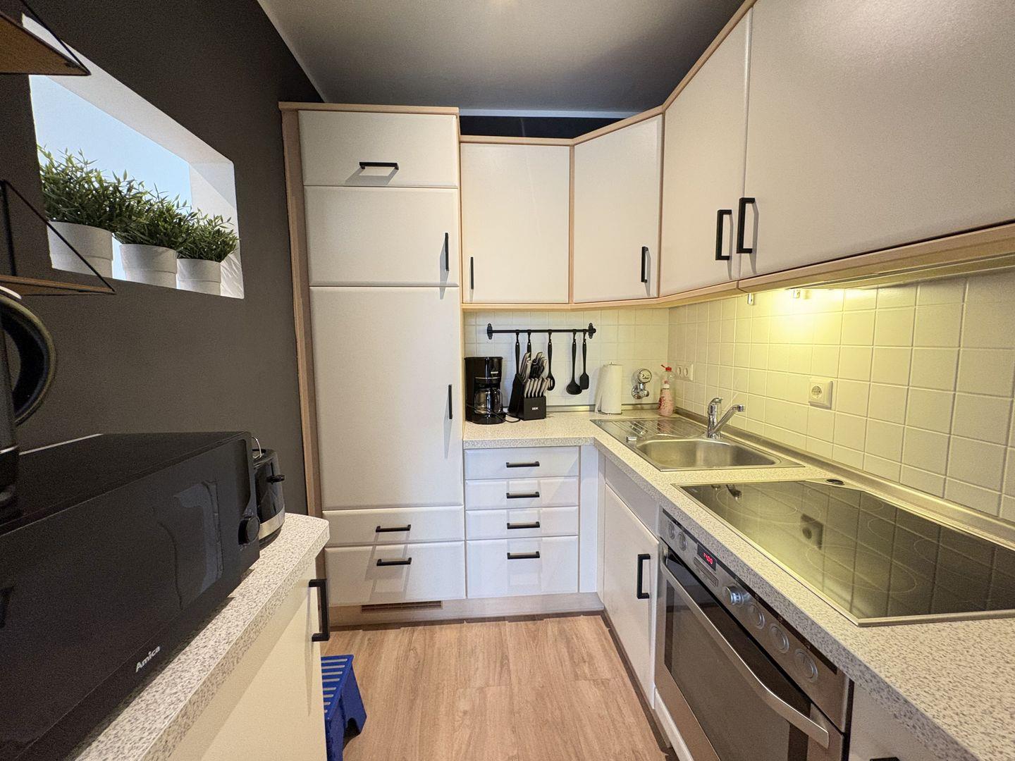 - zum Wohnbereich separate Küche mit Backofen, Mikrowelle, etc.