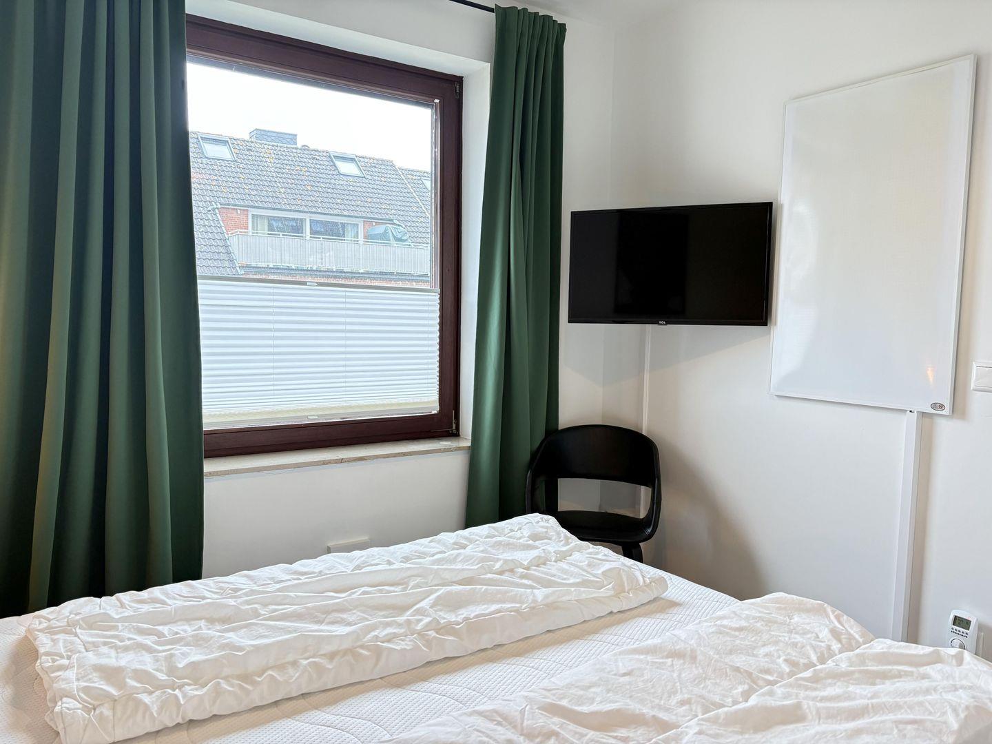 - Schlafzimmer mit Doppelbett (2 Matratzen 90 x 200 cm), Kleiderstange und TV