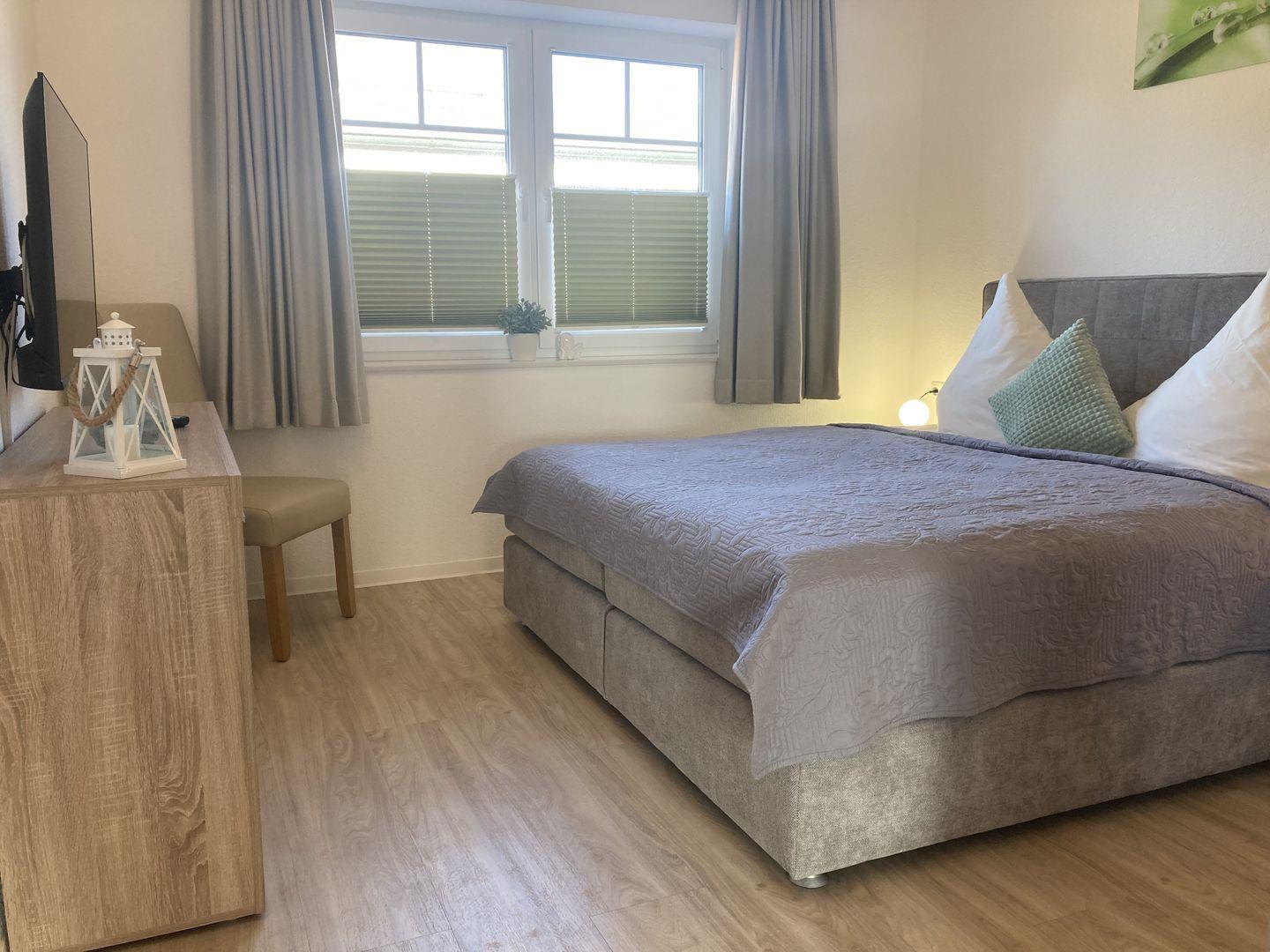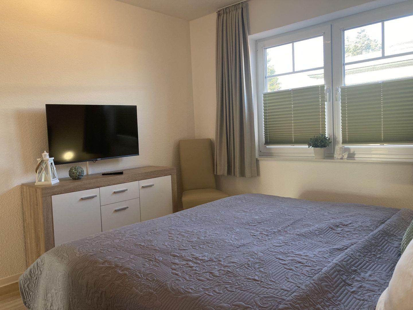 - Schlafzimmer mit Doppelbett, Kleiderschrank und TV