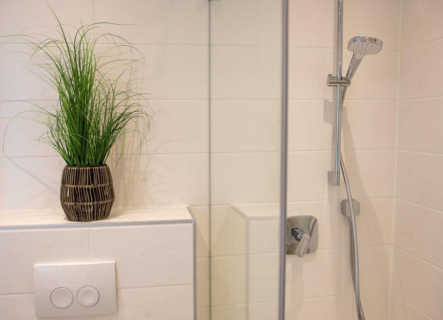 - Badezimmer mit Dusche, WC, Waschtisch, Kosmetikspiegel