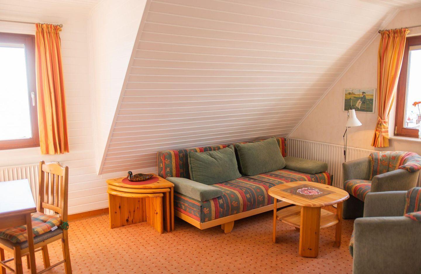 - Wohnzimmer 2-sitzigem Sofa, Sessel und TV