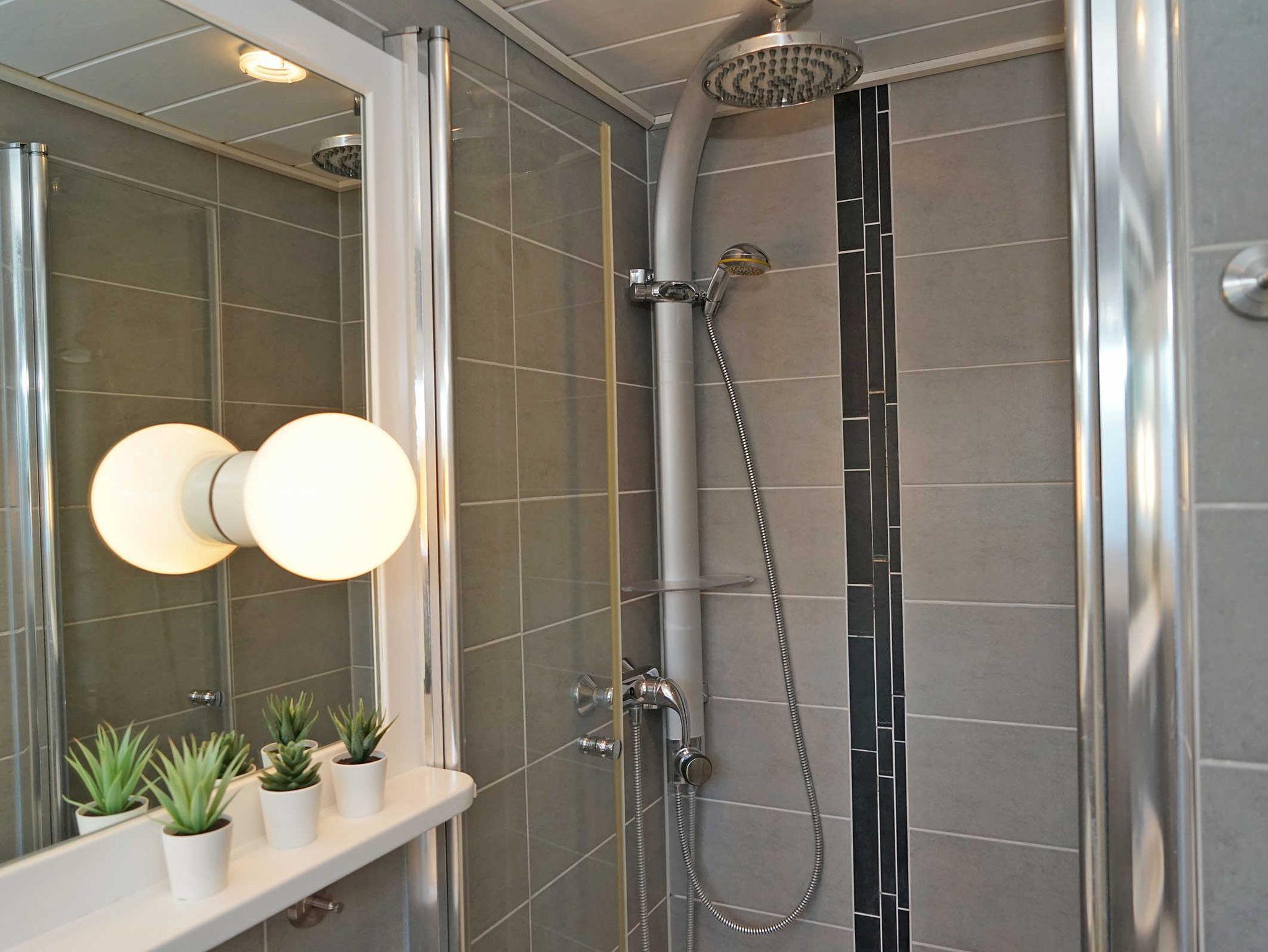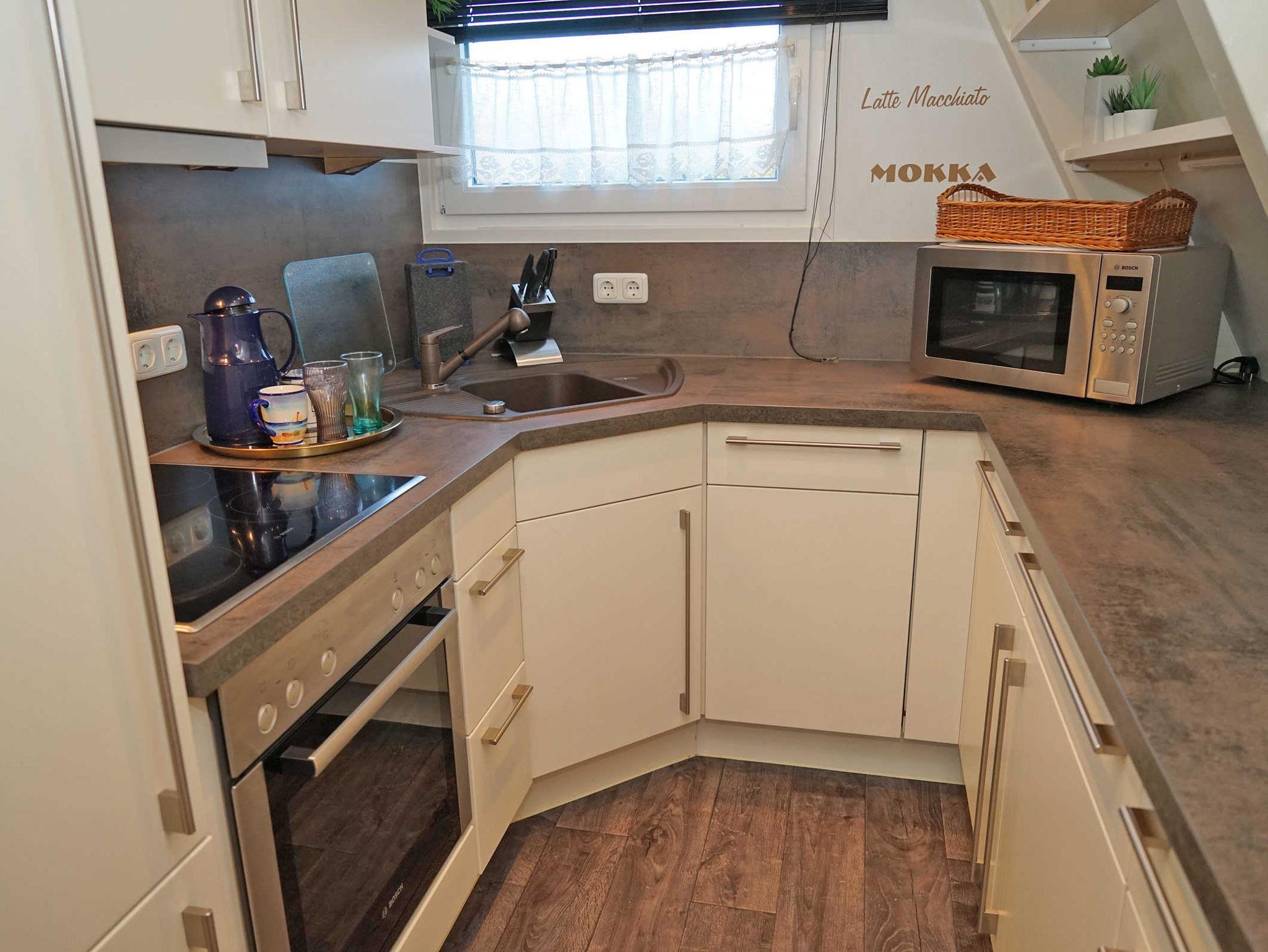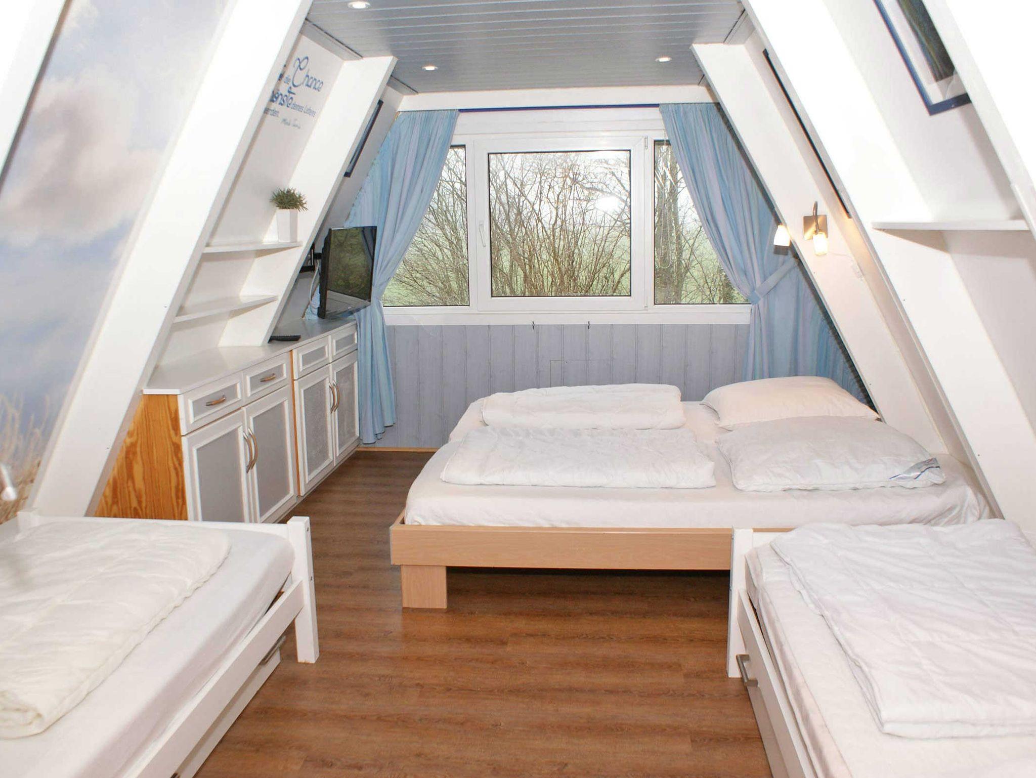 Das Zeltdachhaus verfügt über zwei getrennte Schlafräume (im oberen Bereich des Hauses), kombiniertes Wohn- und Esszimmer, vollwertige Küche und Terrasse. Ein Kinderreisebett und Kinderhochstuhl sind immer vorhanden und kostenlos nutzbar.