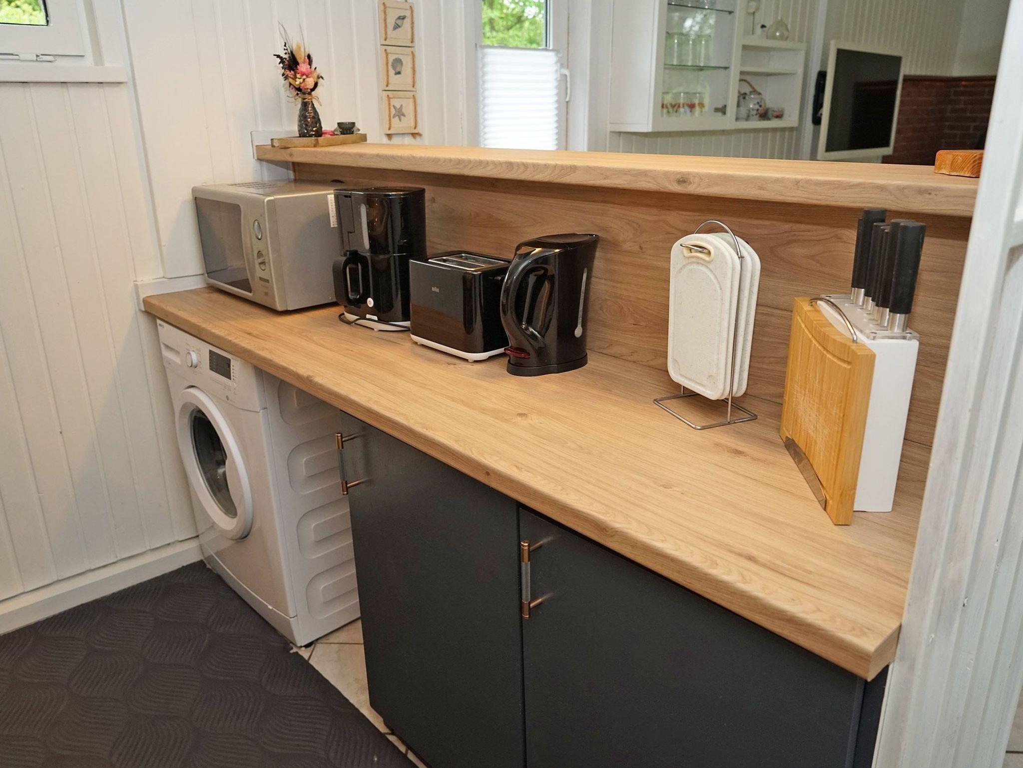 Unser Blockhaus verfügt über zwei getrennte Schlafräume, kombiniertes Wohn- und Esszimmer, vollwertige Küche und Terrasse. Ein Kinderreisebett und Kinderhochstuhl sind immer vorhanden und kostenlos nutzbar.