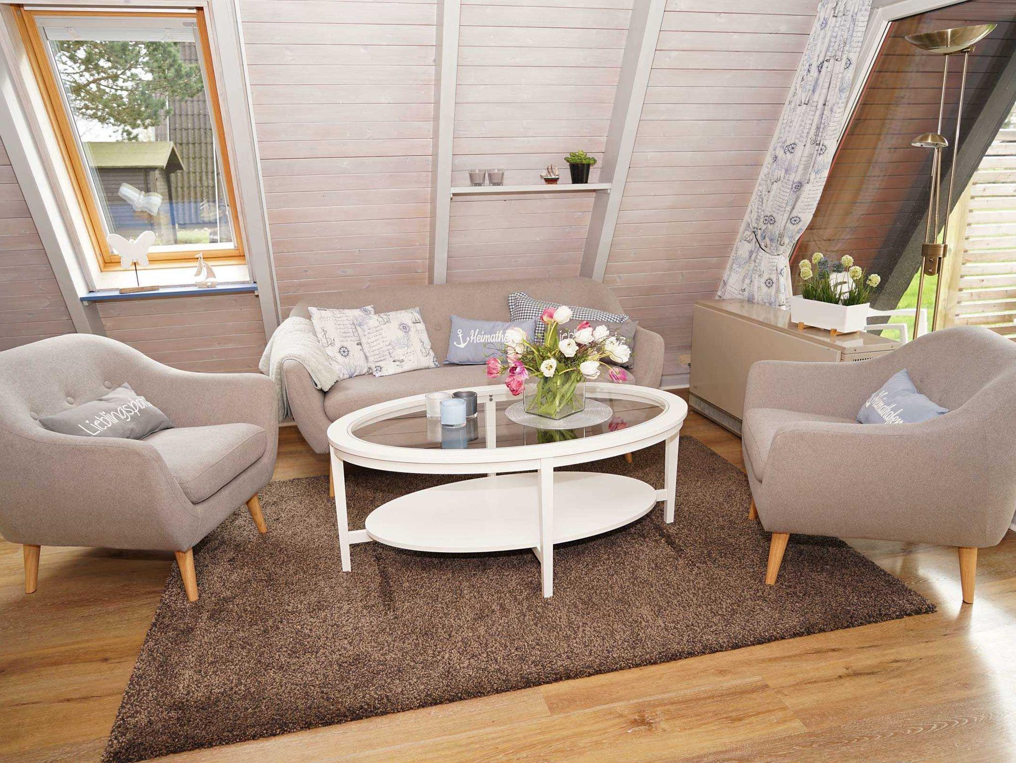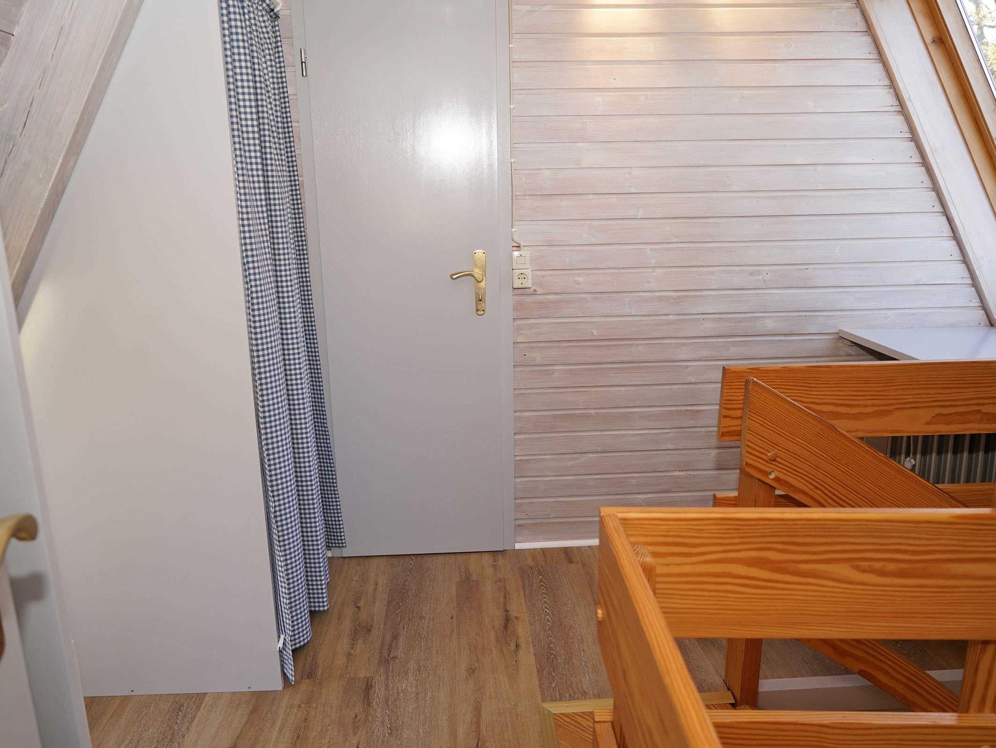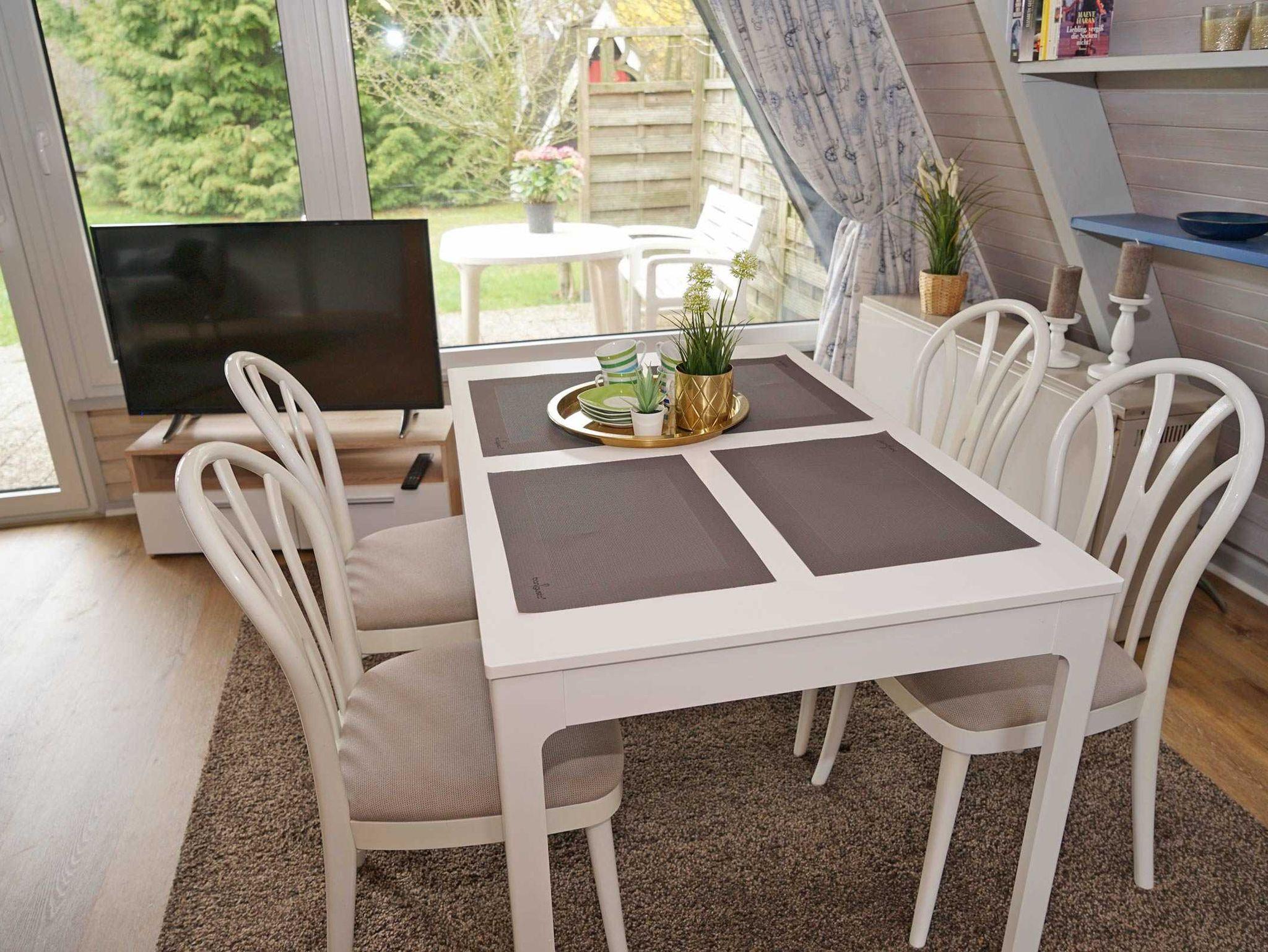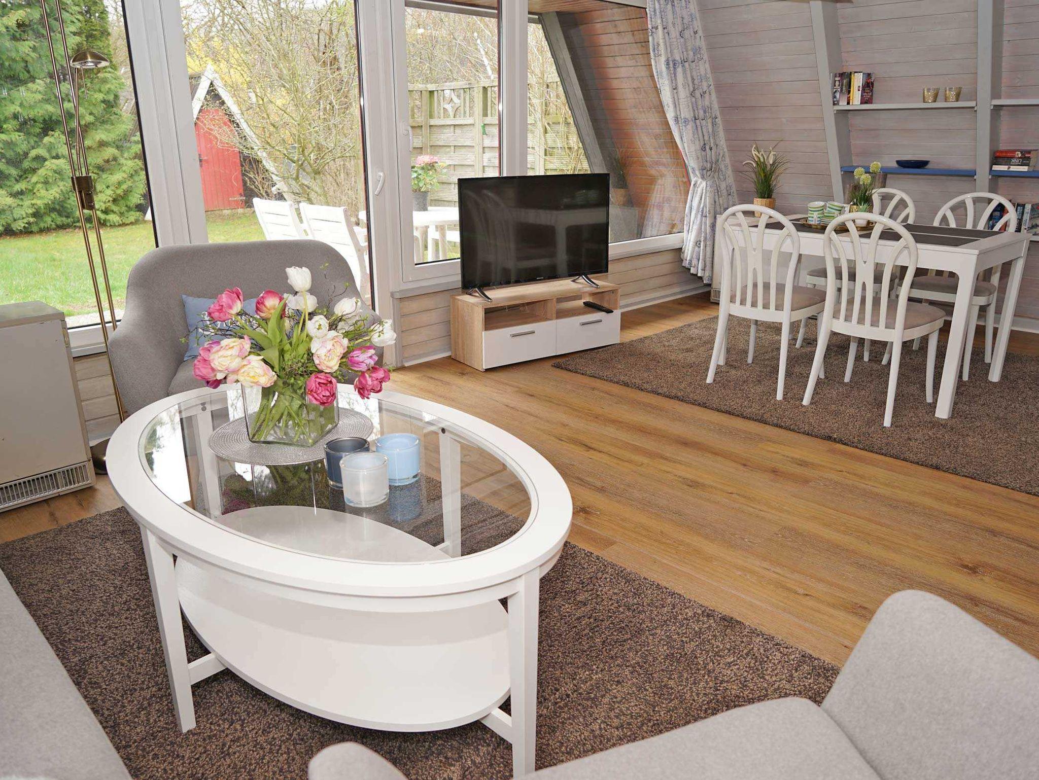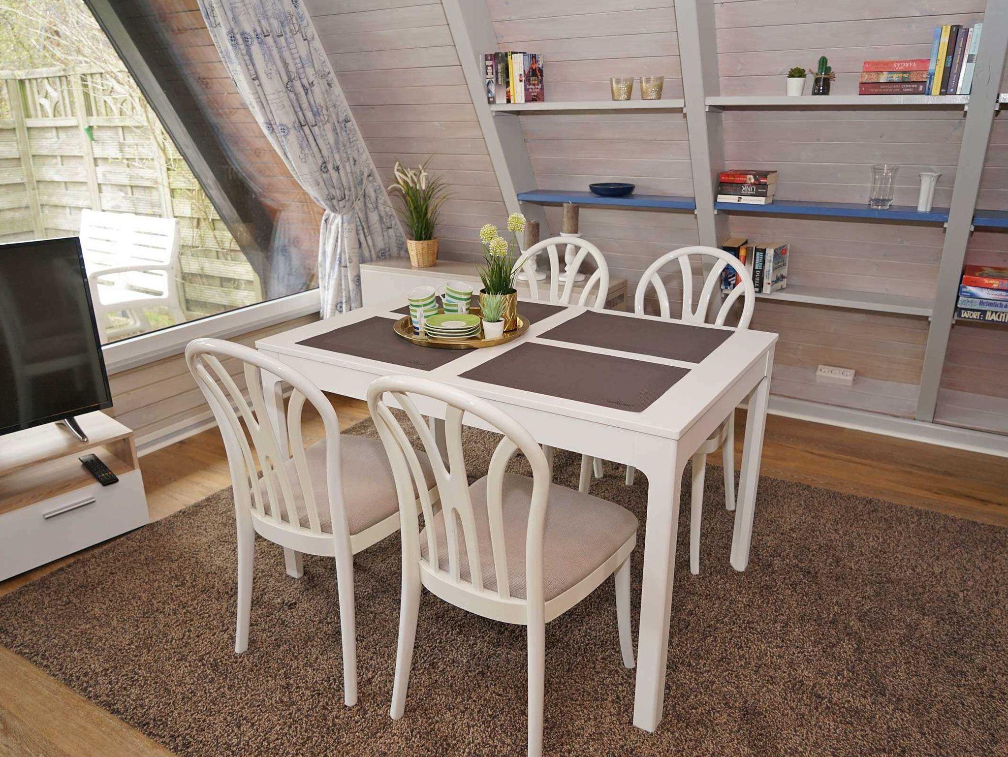 Unser Zeltdachhaus verfügt über zwei getrennte Schlafräume (im oberen Bereich des Hauses), kombiniertes Wohn- und Esszimmer, vollwertige Küche und Terrasse. KInderreisebett und Kinderhochstuhl sind immer vorhanden und kostenlos nutzbar.