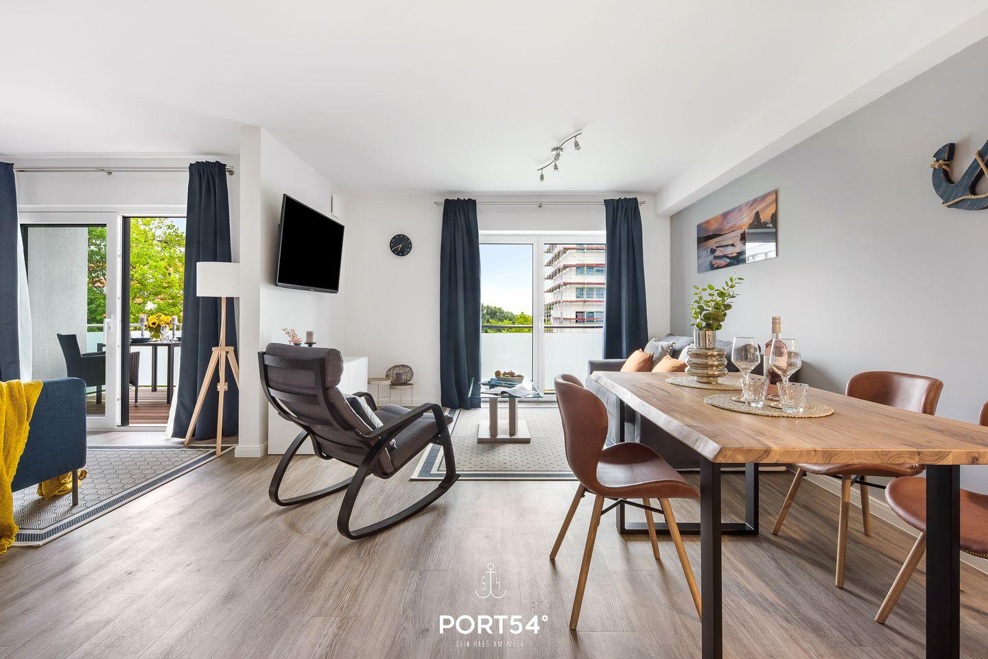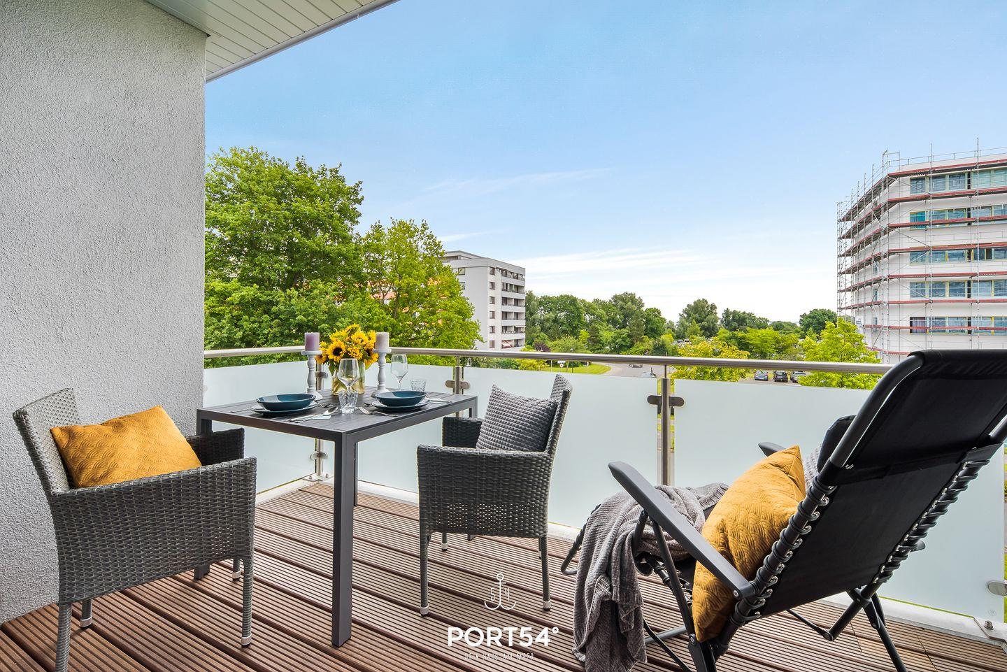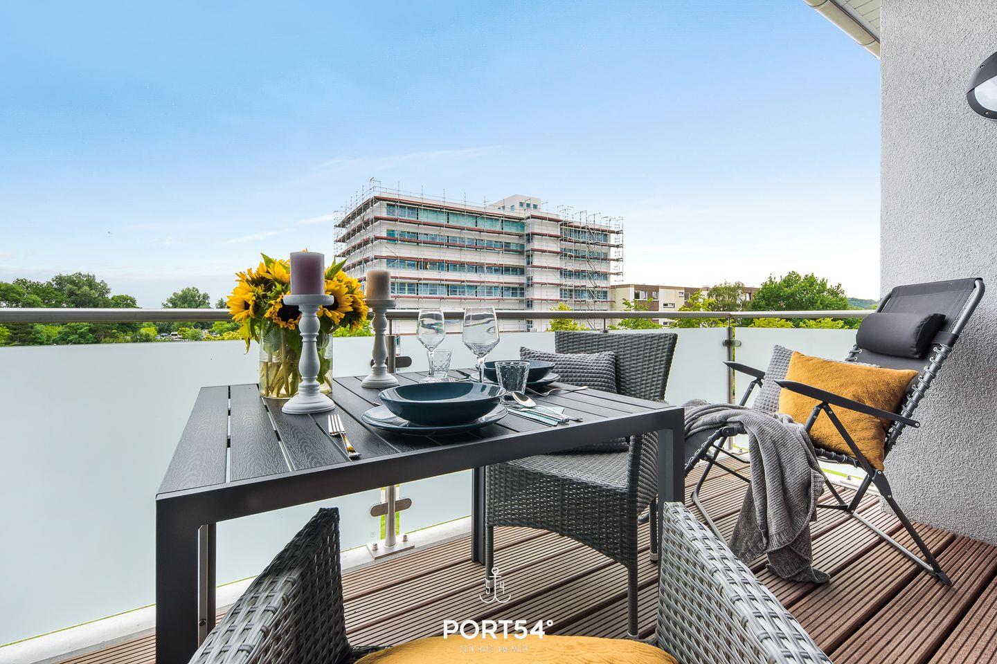 Moderne Ferienwohnung "Meerzeit" in Damp mit Balkon, Gartenmöbeln, TV und Waschmaschine für entspannte Urlaubstage.