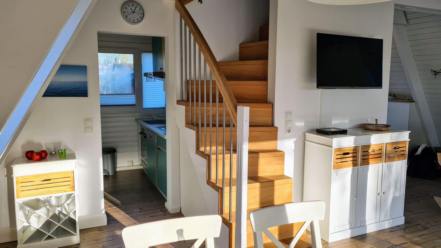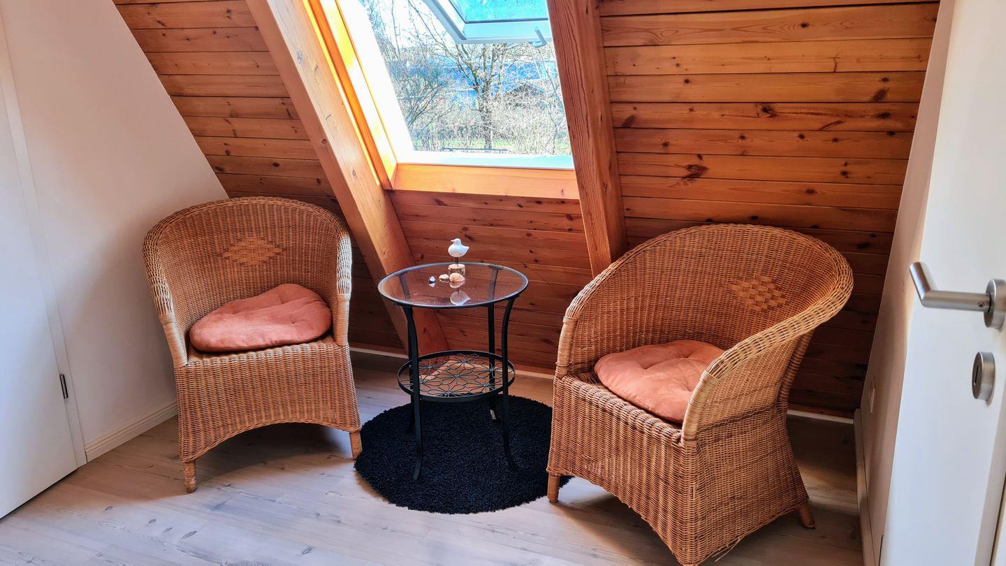 Vom Wohnbereich aus führt eine Treppe in die obere Etage. Hier erwartet Sie ein kleiner Bereich, um sich mit einem guten Buch zurückzuziehen und die beiden Schlafzimmer, eines mit Doppelbett und eines mit zwei Einzelbetten. Ein Bettchen für unsere kleinen Gäste bis 2,5 Jahre kann bei Bedarf aufgestellt werden.