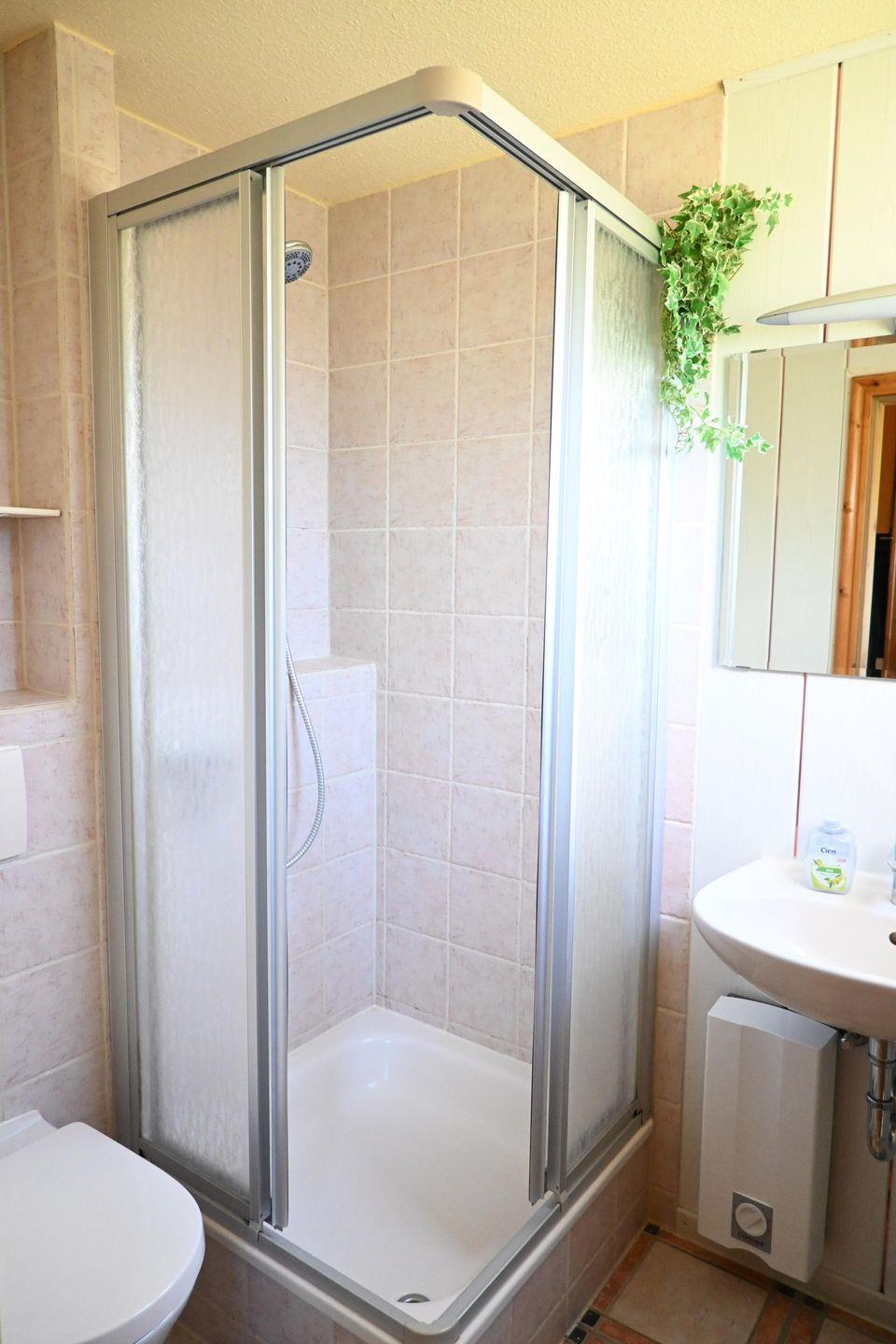 Das Haus verfügt über zwei gemütliche Schlafzimmer, die über eine Treppe ins Obergeschoss des Hauses zu erreichen sind. Hier finden Sie bequem Platz für erholsame Nächte. Das Badezimmer im Erdgeschoss ist modern gestaltet und bietet eine Dusche, WC und Waschbecken – alles was Sie für Ihren Aufenthalt benötigen. Ein zusätzliches Highlight ist der großzügige Wohnbereich mit Zugang zur Küche. Diese ist bestens ausgestattet mit einem Elektroherd, Backofen, Mikrowelle, Spülmaschine und Kühlschrank.