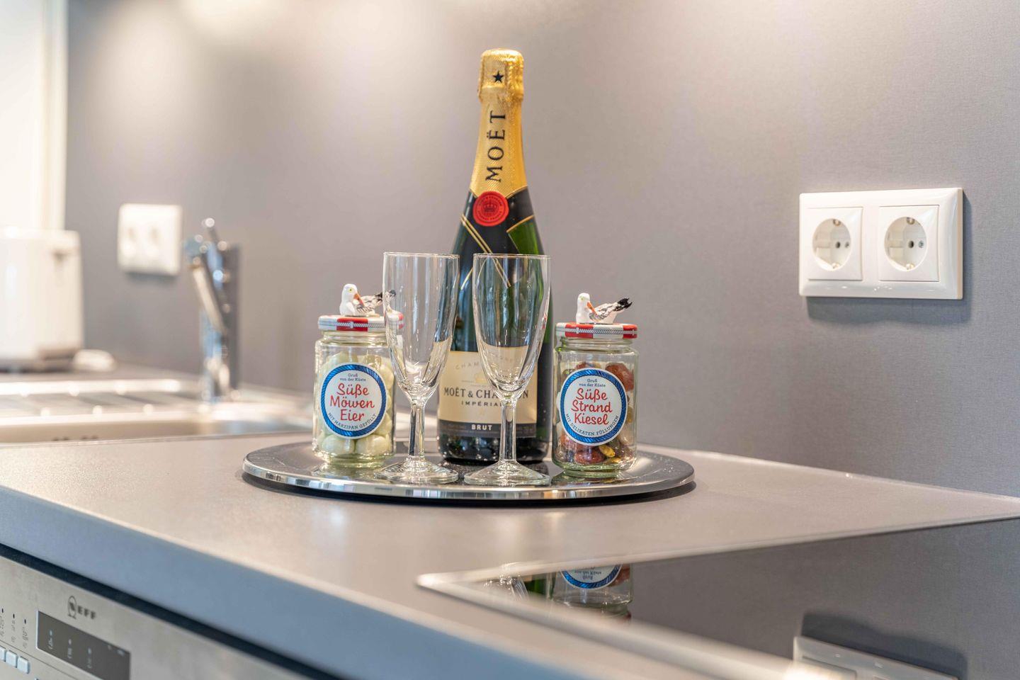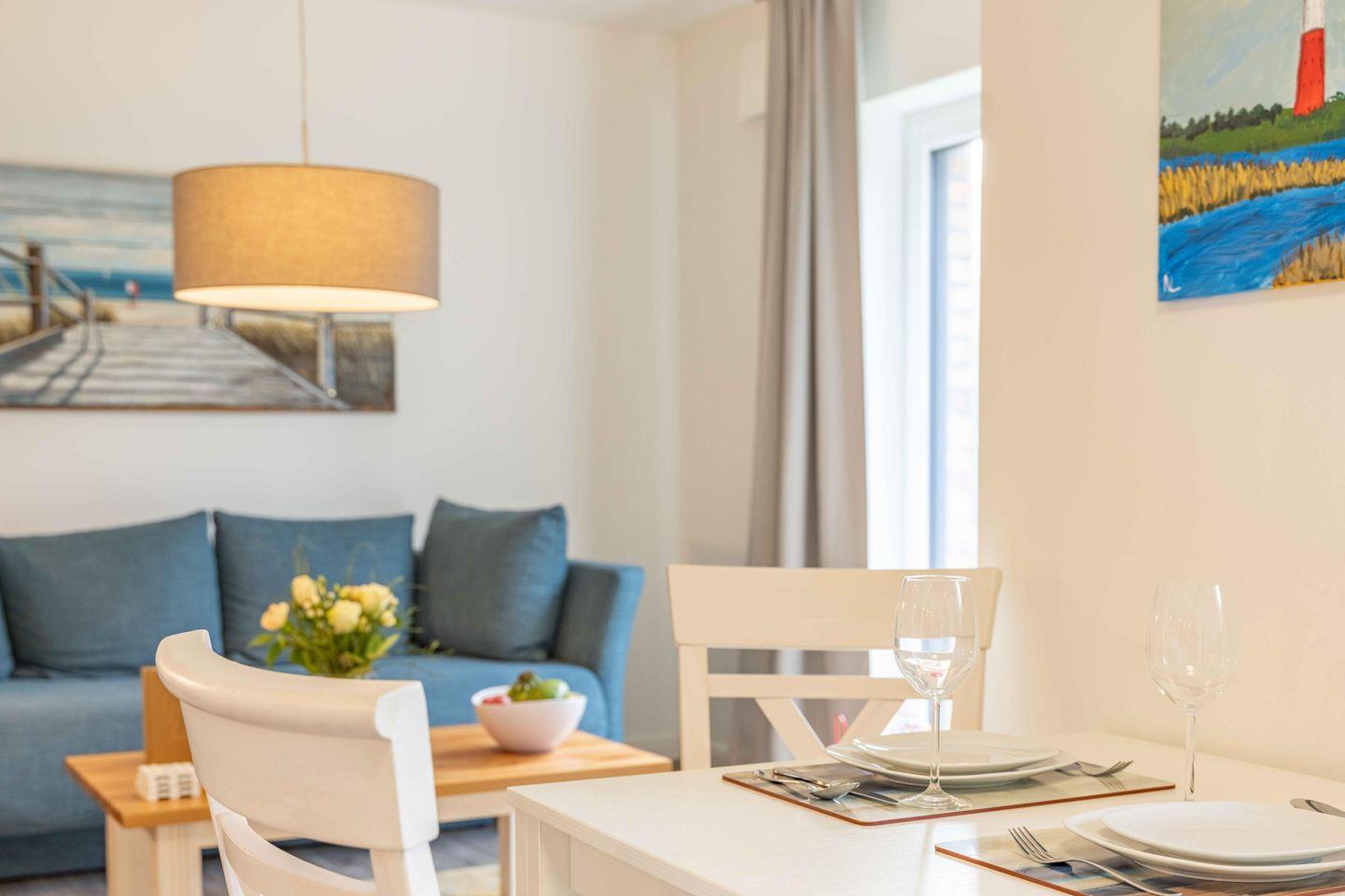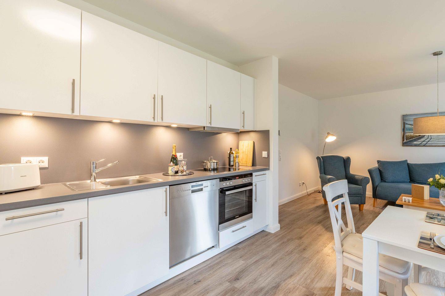 Die hochwertige Ausstattung der Ferienwohnung lässt keine Wünsche offen. Eine vollständig eingerichtete, offene Küche, die direkt in den Wohnbereich übergeht, verfügt unter anderem über einen Backofen, Geschirrspüler, einen Kühlschrank mit Gefrierfach sowie zahlreiche Küchengeräte wie eine Kaffeemaschine, einen Wasserkocher, einen Toaster und eine Espressomaschine. Hier kannst Du hervorragend selbst für Dein leibliches Wohl sorgen, während Du Dich im gemütlichen Essbereich zusammenfindest.
