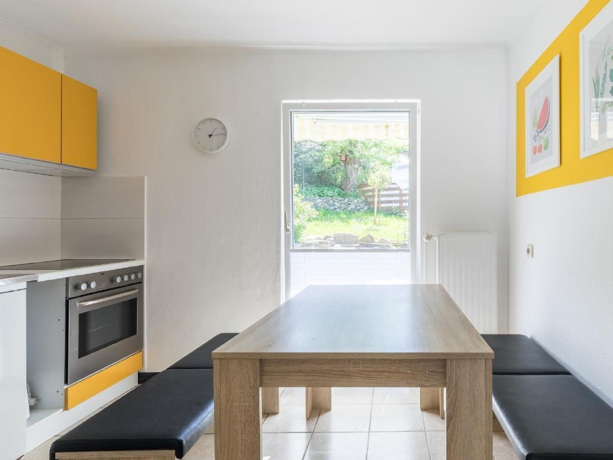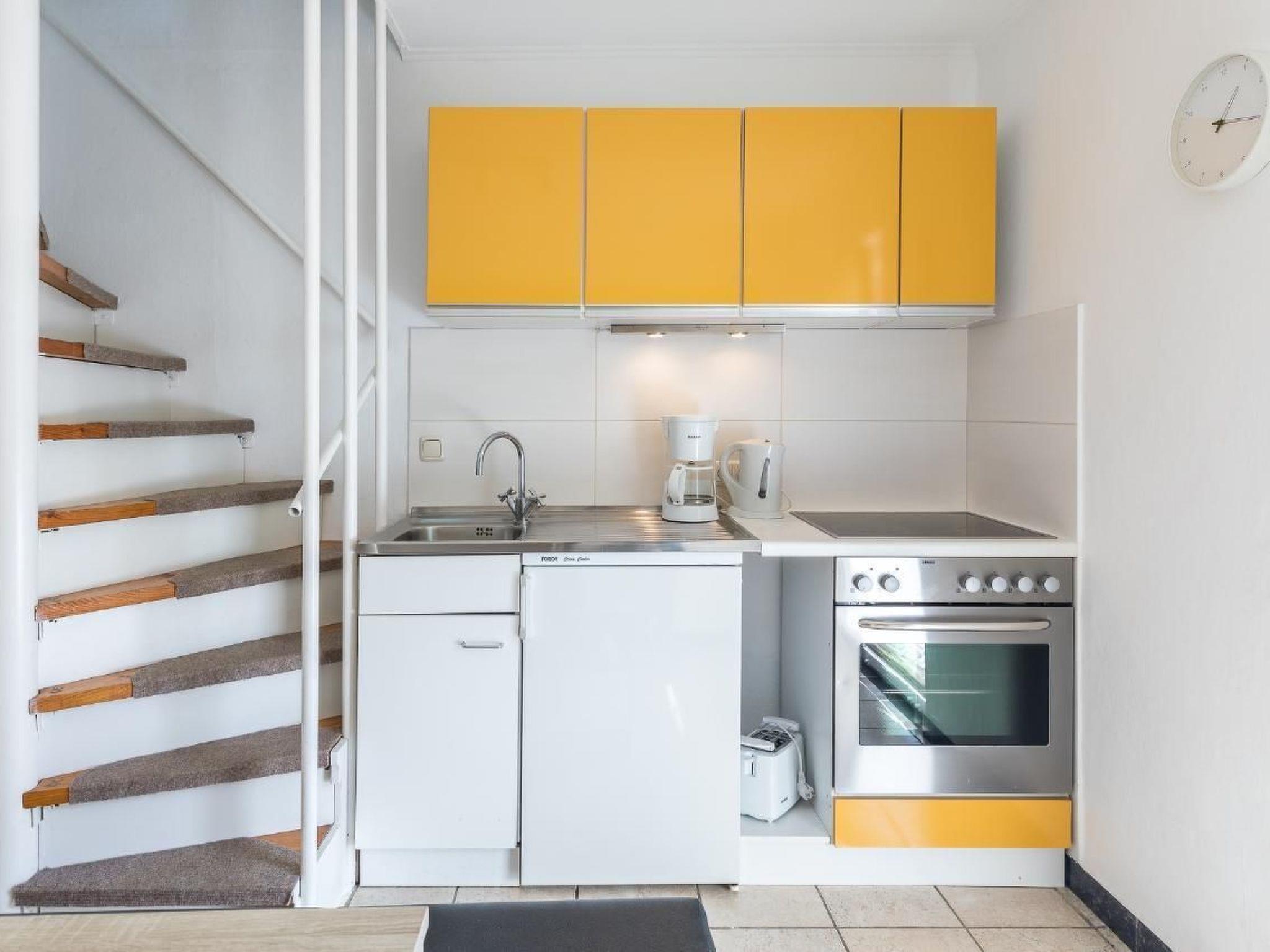 Die Wohnung hat eine separate Küche. Es sind folgende Geräte vorhanden: Herd mit Backofen, Kühlschrank mit Eisfach, Wasserkocher, Kaffeemaschine, Geschirr usw. Das Schlafzimmer (für 4 P) erreicht man über eine schmale Wendeltreppe. Es besteht die Möglichkeit, dass vorhandene Kinderreisebett im Schlafzimmer (OG) aufzustellen. Das Bad hat Dusche und WC. Im Wohnzimmer steht ein Fernseher. Hier können ebenfalls 2 Personen auf der Schlafcouch (ausgezogen 1,60x2,00m)übernachten. Es gibt einen hauseigenen Stellplatz.
