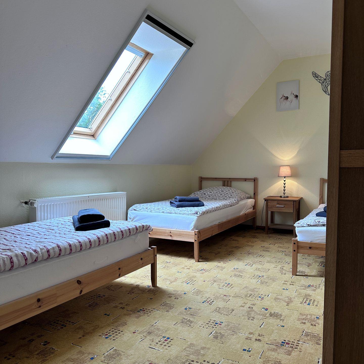 Ein Schlafzimmer hat 3 Einzelbetten und einen Kleiderschrank. Das andere hat ein Doppelbett, ein Kinderbett und Kleiderschrank.
