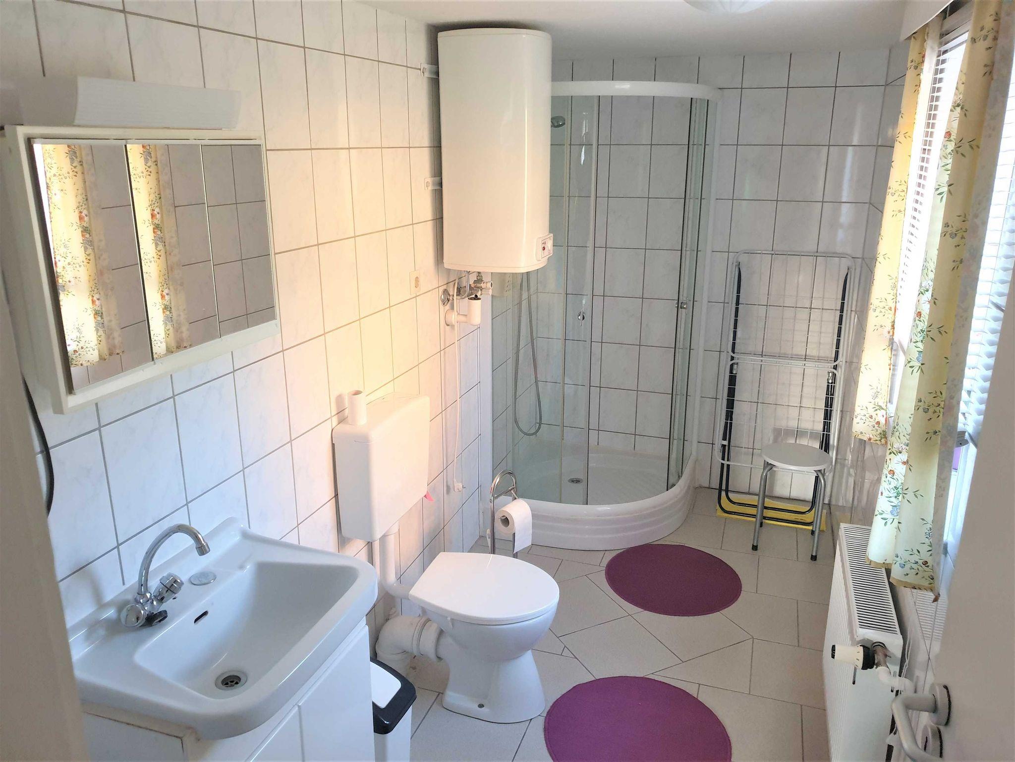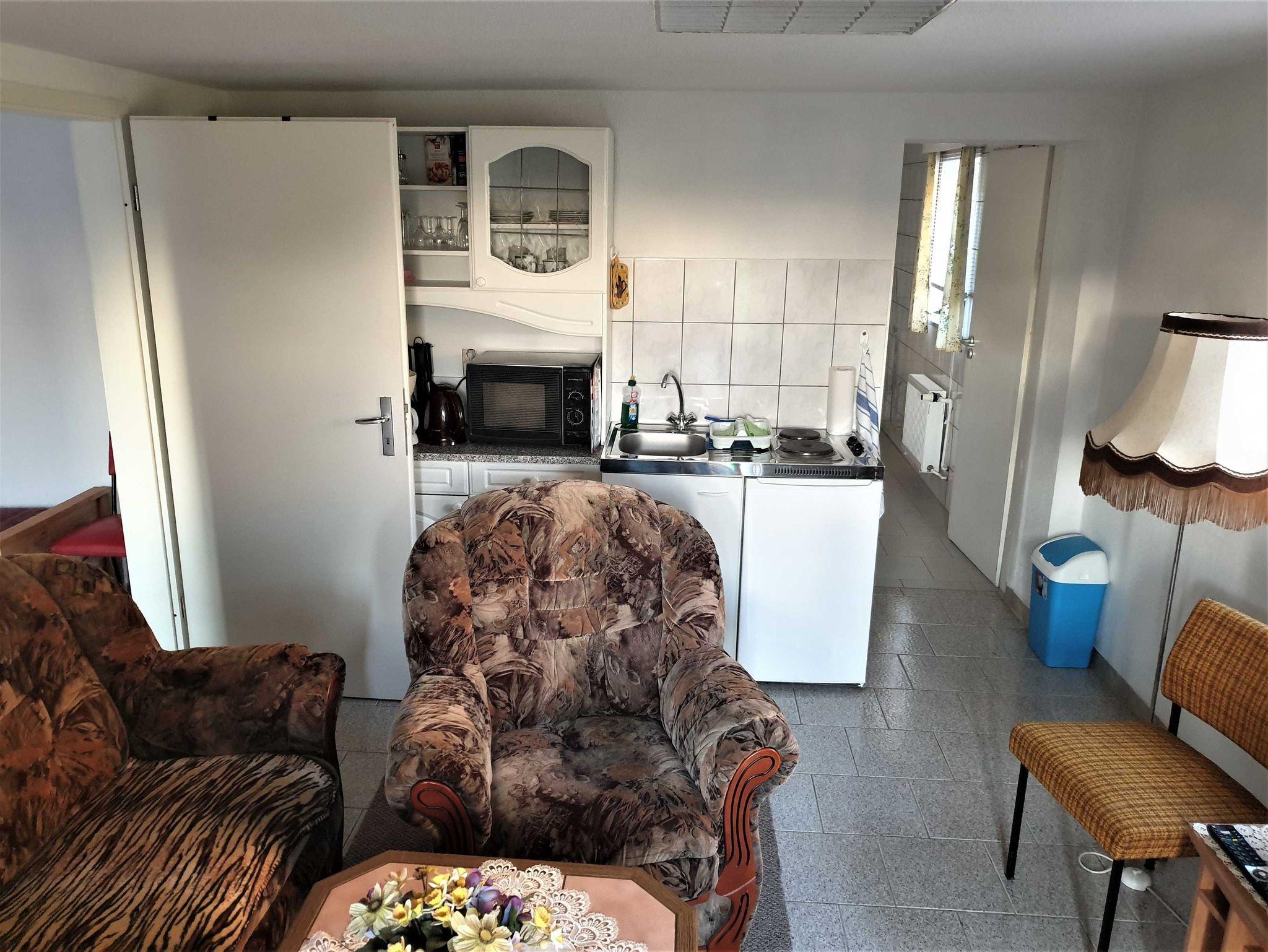 Die Ferienwohnung befindet sich im Erdgeschoß. Das Wohnzimmer mit offener Mini-Küche ist mit verschiedenen Küchengeräten ausgestattet. Schlafzimmer für 3 Personen, DU/WC