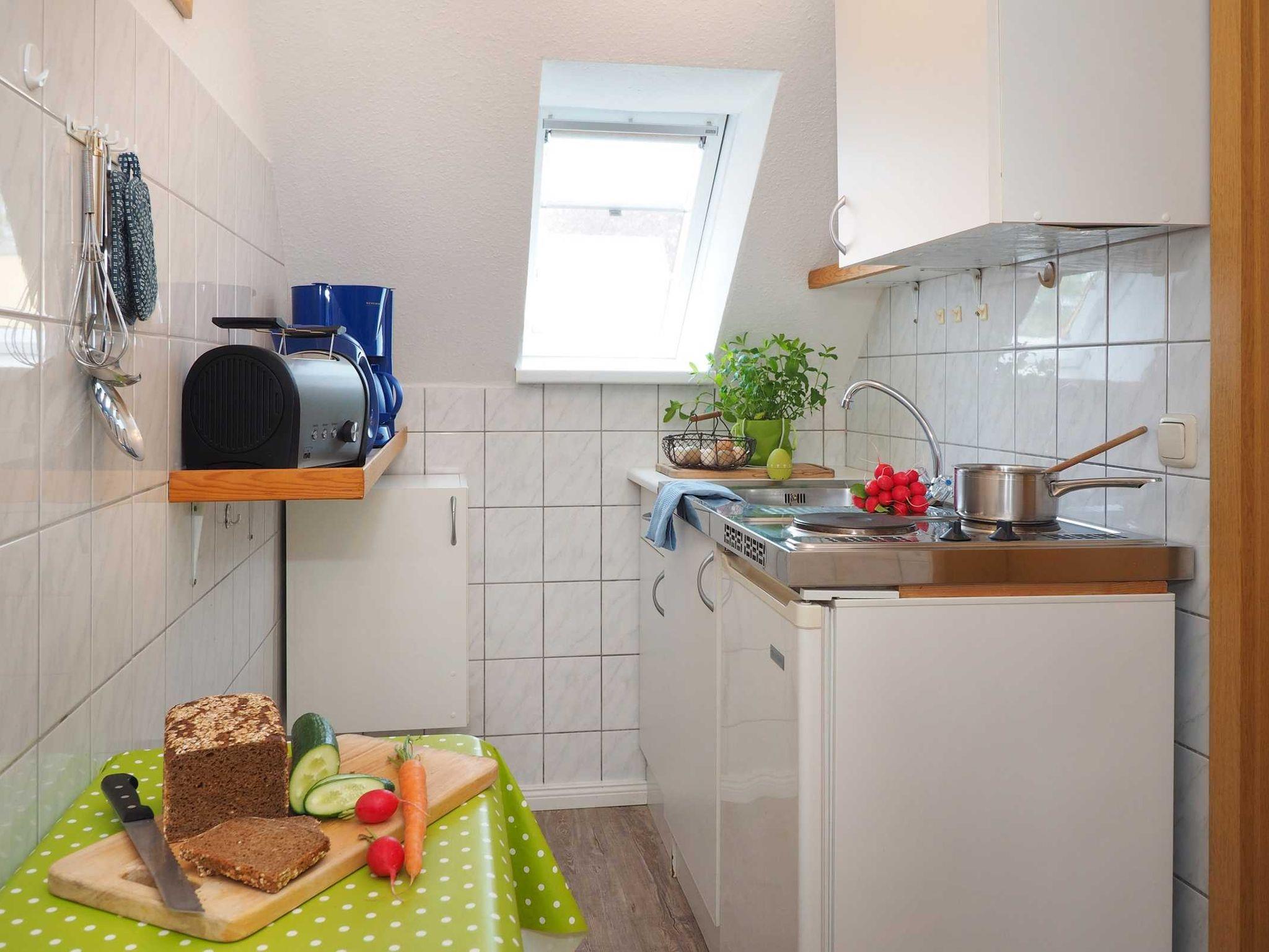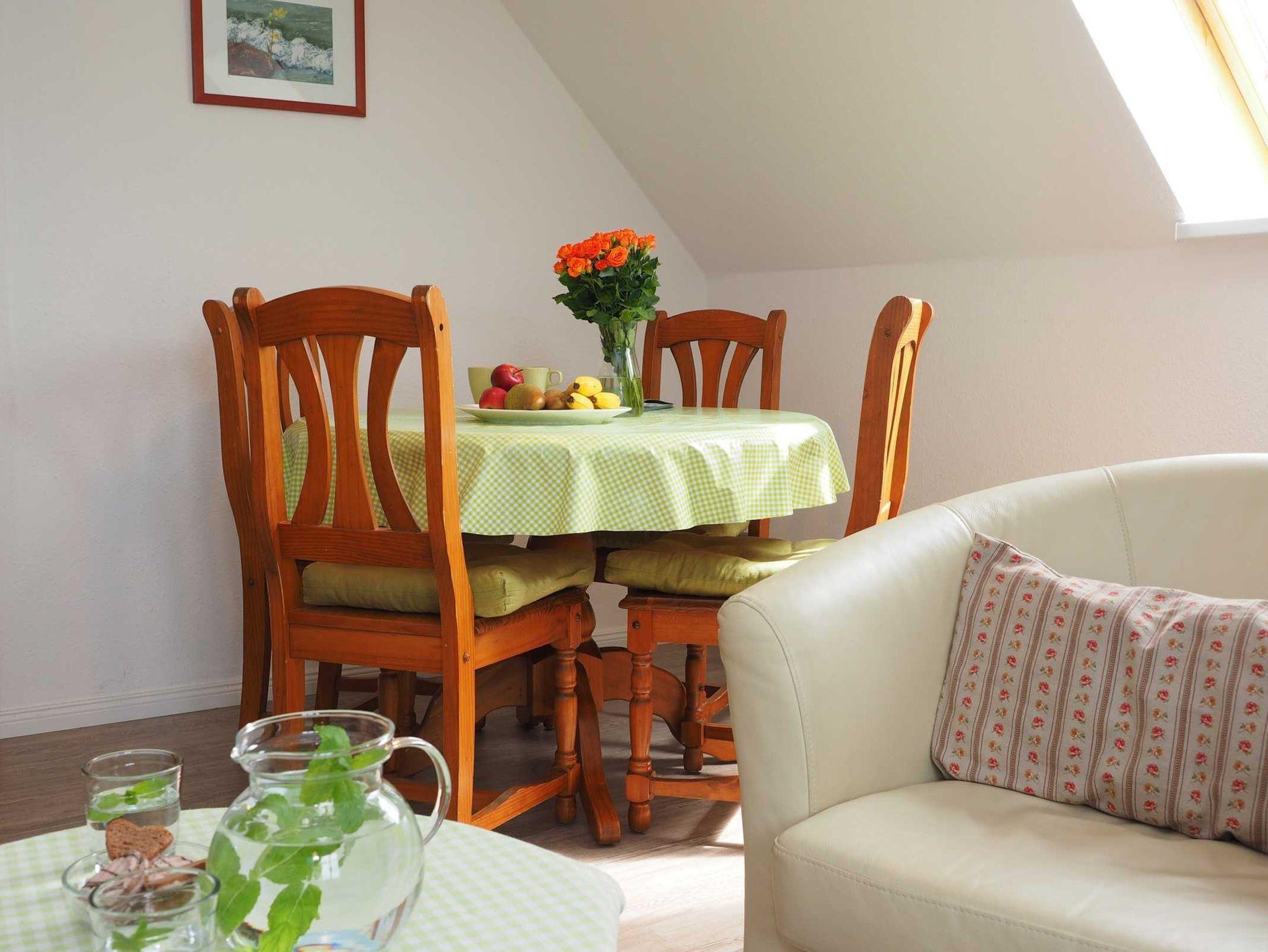 Unsere Ferienwohnung Strohboden liegt im Obergeschoss des Ferienhauses. Von hier aus sieht man hinter den Feldern und Wiesen das Stettiner Haff schimmern. Wir haben die Ferienwohnug liebevoll im Landhausstil mit schönen Holzmöbeln eingerichtet - Behaglichkeit und Komfort: im großem Wohn- und Esszimmer, zwei separaten Schlafzimmern (einmal mit Doppelbett, einmal mit zwei Einzelbetten), kleiner Küche und einem Duschbad. Die Wohnung ist für 4 Personen eingerichtet. Familien mit Kindern sind uns herzlich willkommen. Eine Baby- und Kinderausstattung (Kinderbett, Hochstuhl, Töpfchen) gehört bei uns auf Wunsch selbstverständlich kostenlos mit dazu. Waschmöglichkeit.