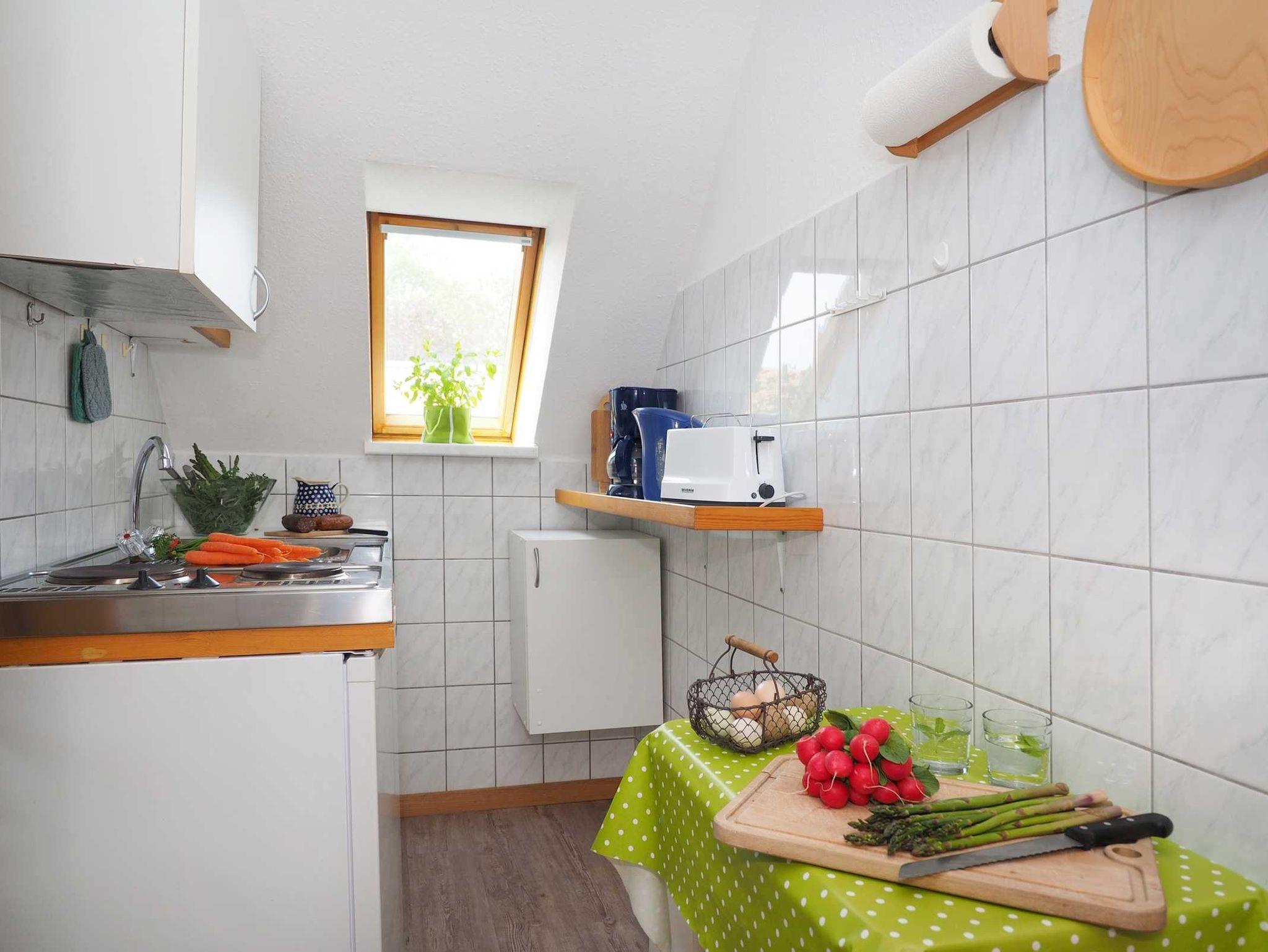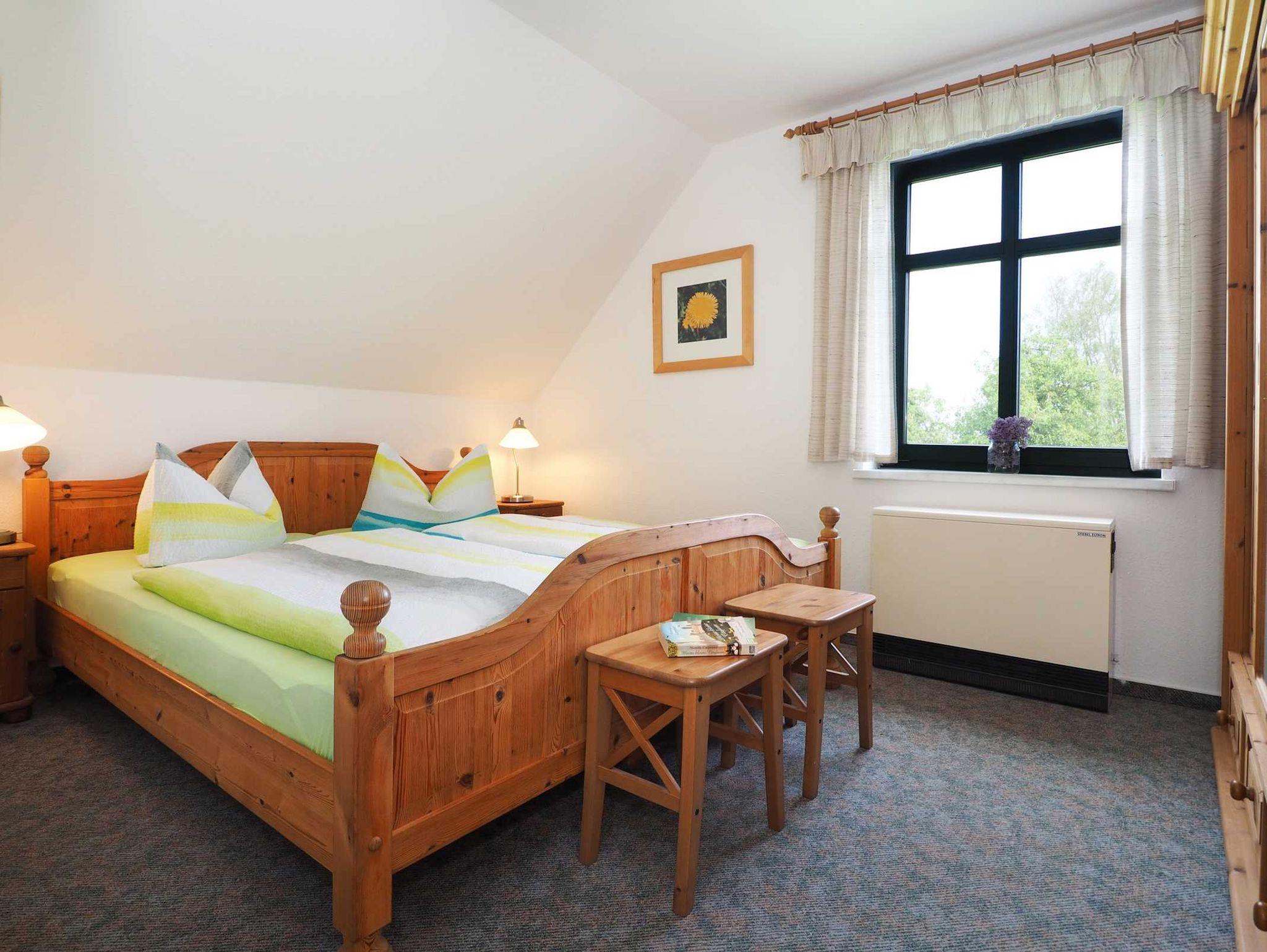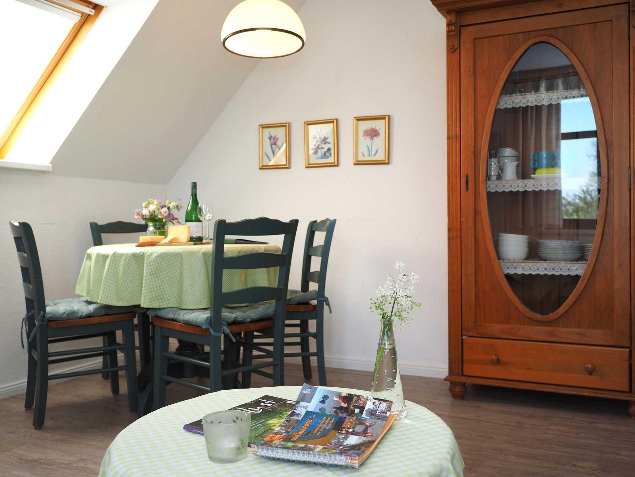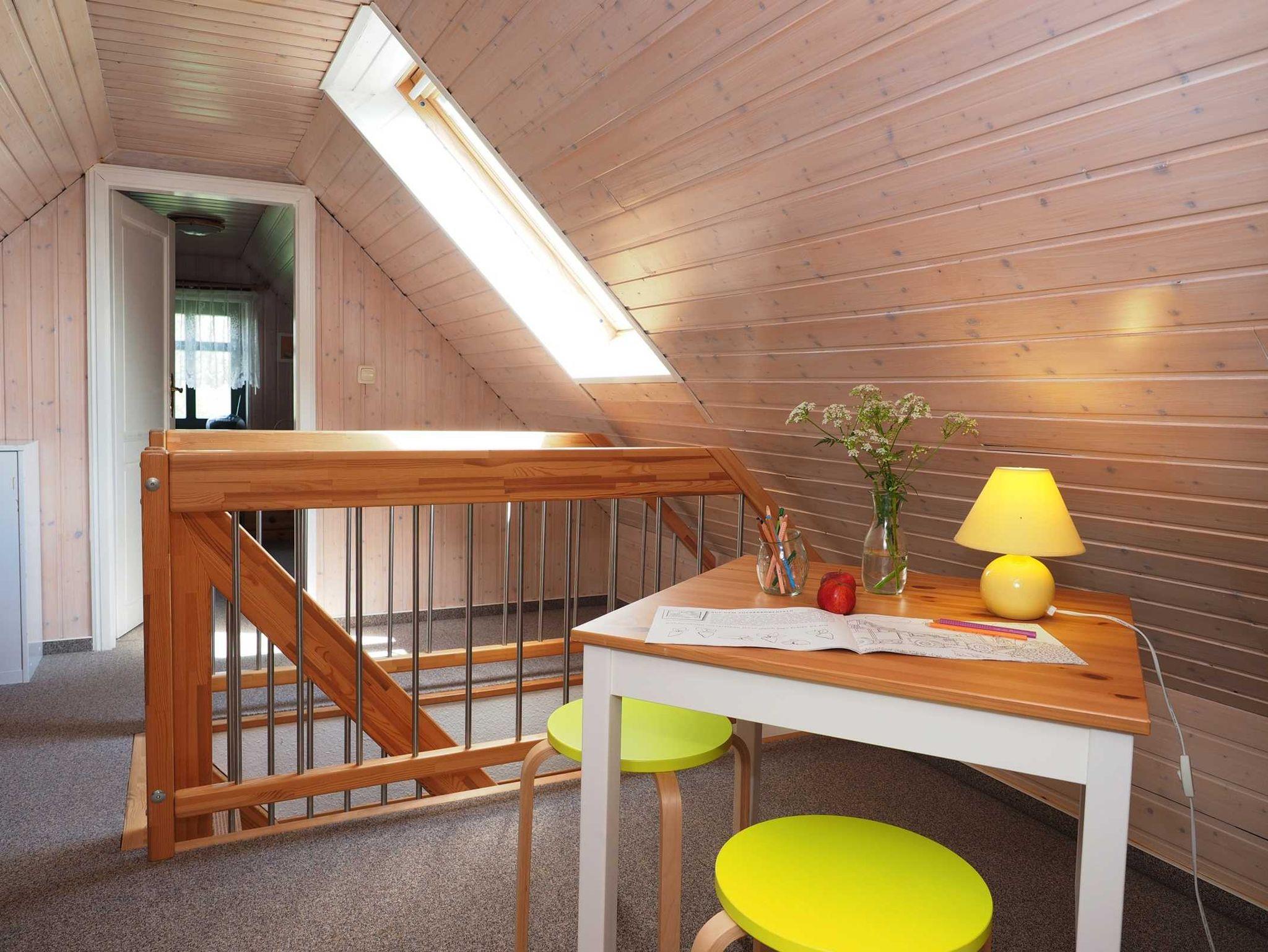 Unsere Ferienwohnung Heuboden liegt im Obergeschoss des Ferienhauses. Von hier aus sieht man hinter den Feldern und Wiesen das Stettiner Haff schimmern. Wir haben die Ferienwohnug liebevoll im Landhausstil mit schönen Holzmöbeln eingerichtet - Behaglichkeit und Komfort: im großem Wohn- und Esszimmer, zwei separaten Schlafzimmern (einmal mit Doppelbett, einmal mit zwei Einzelbetten), kleiner Küche und einem Duschbad. Beim Heuboden liegt das zweite Schlafzimmer im Spitzboden über der Wohnung - ein Spielflur davor gibt den Kindern ein eigenes kleines Reich. Die Wohnung ist für 4 Personen eingerichtet. Familien mit Kindern sind uns herzlich willkommen. Eine Baby- und Kinderausstattung (Kinderbett, Hochstuhl, Töpfchen, Gläschenwärmer) gehört bei uns auf Wunsch selbstverständlich kostenlos mit dazu. Waschmöglichkeit.