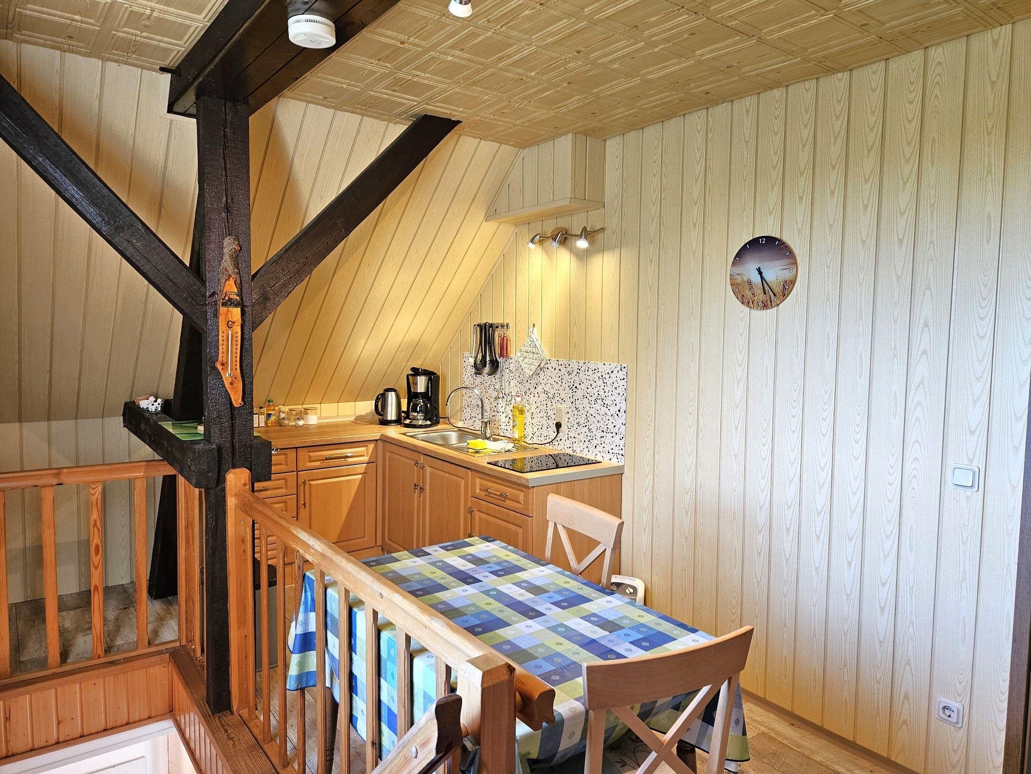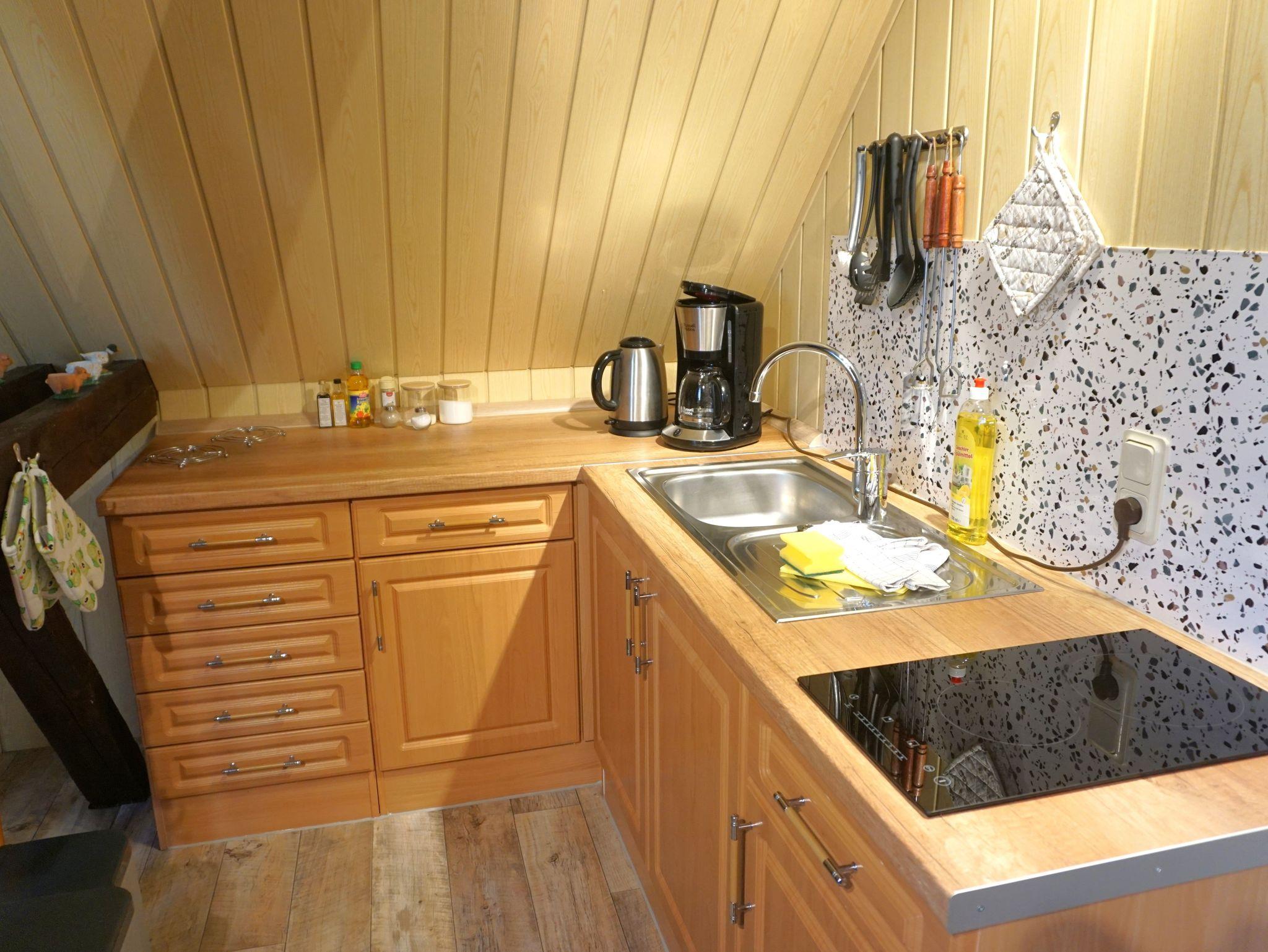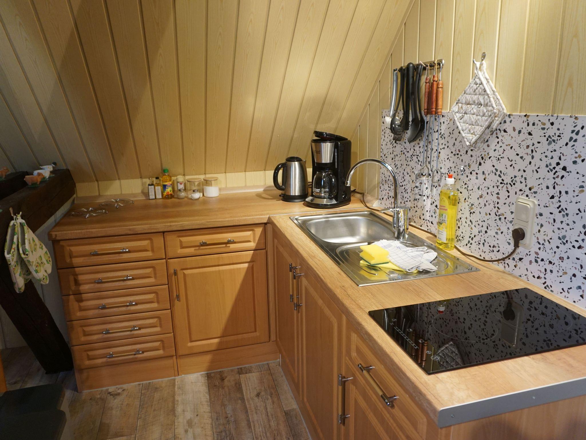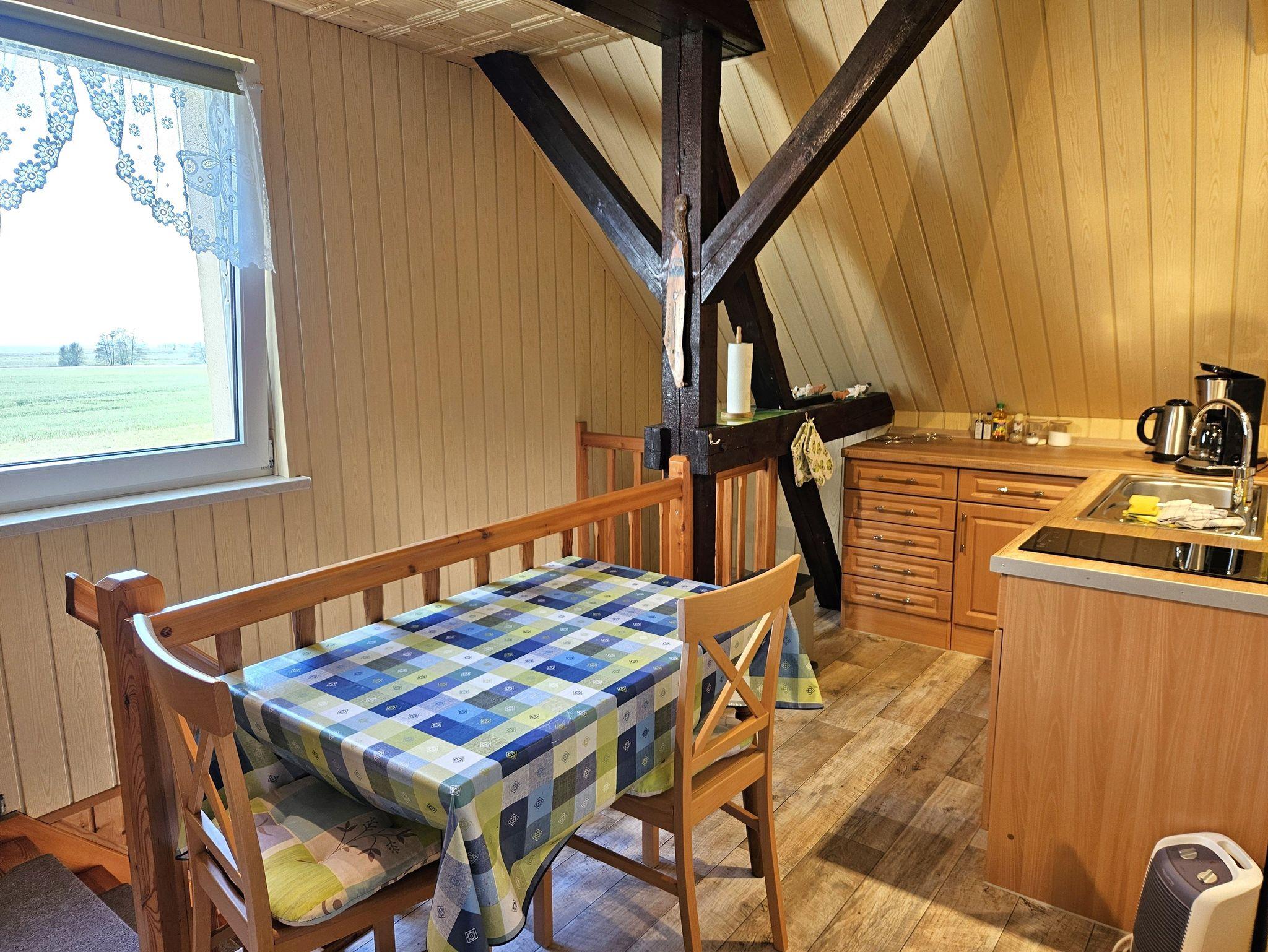 Die Küche mit herrlichem Blick auf das Stettiner Haff, verfügt über eine kleine Küchenzeile mit einem Doppel-Cerankochfeld, einer Mikrowelle mit Backofenfunktion und einem großen Kühlschrank mit Gefrierfach.