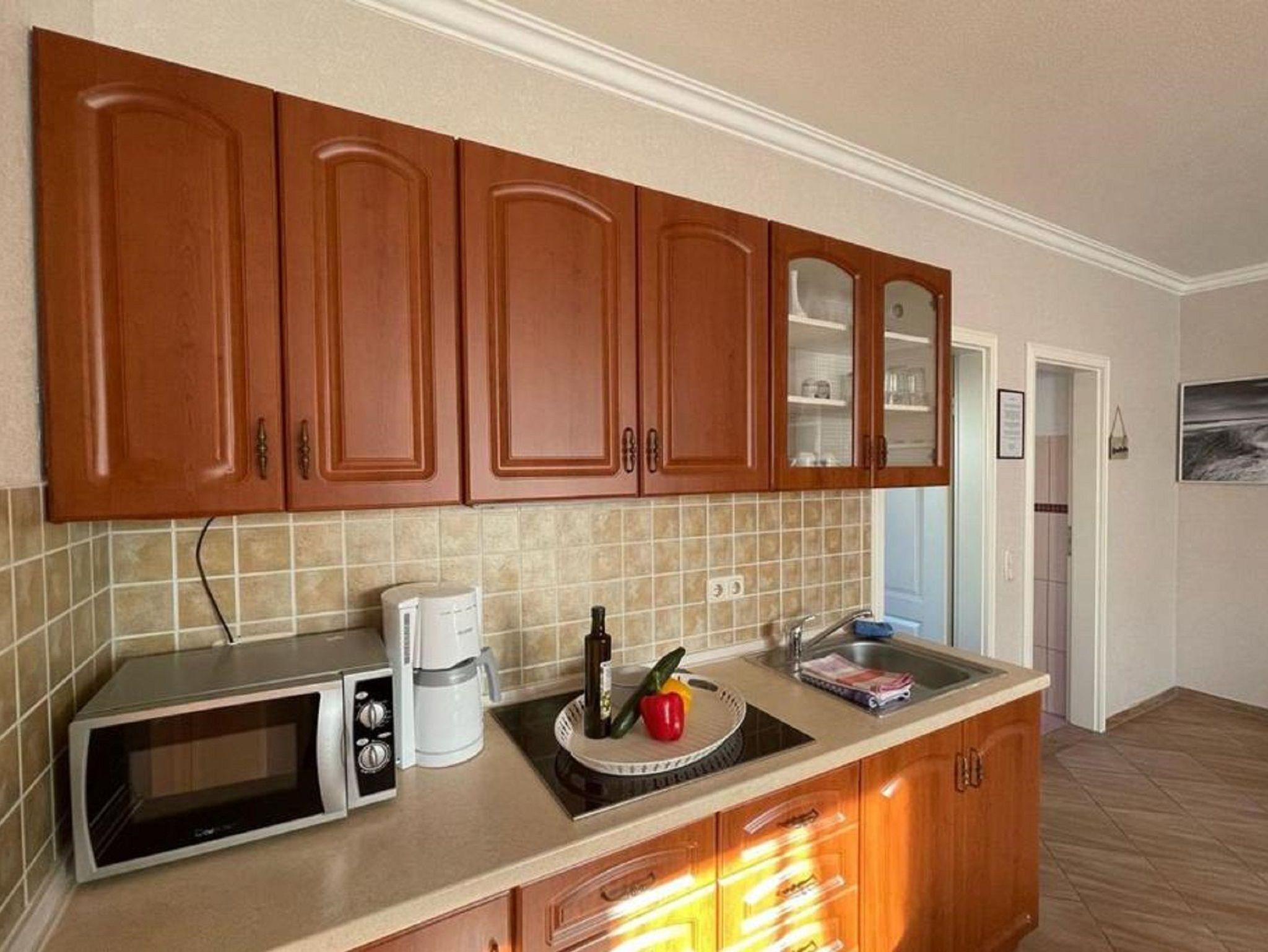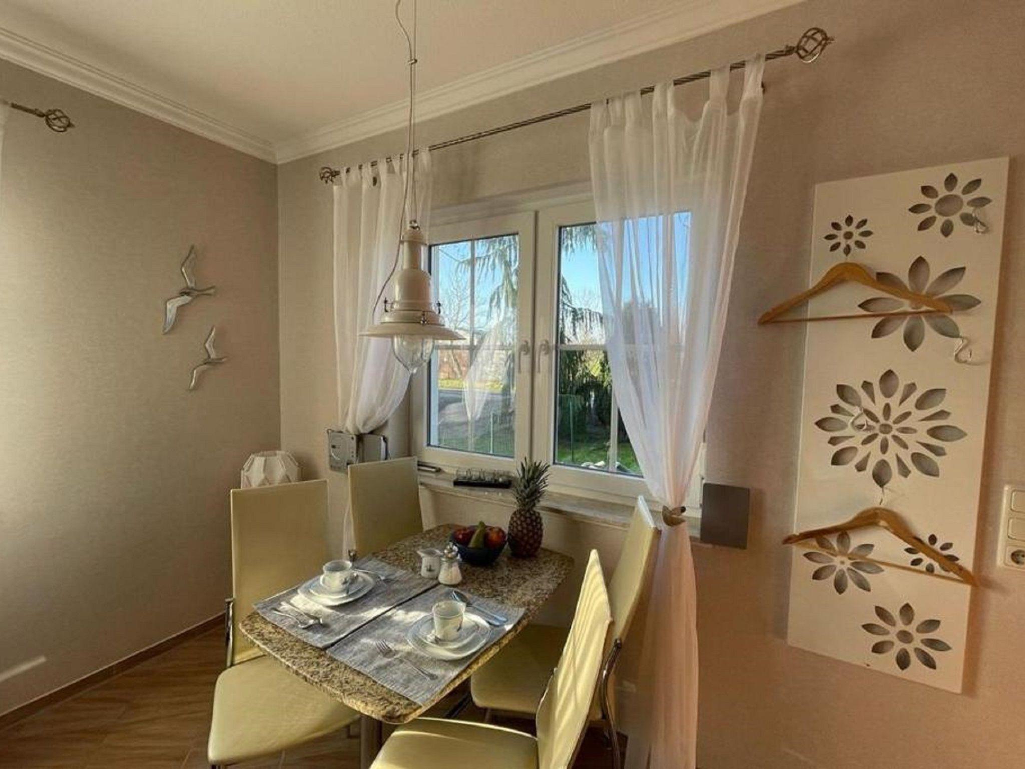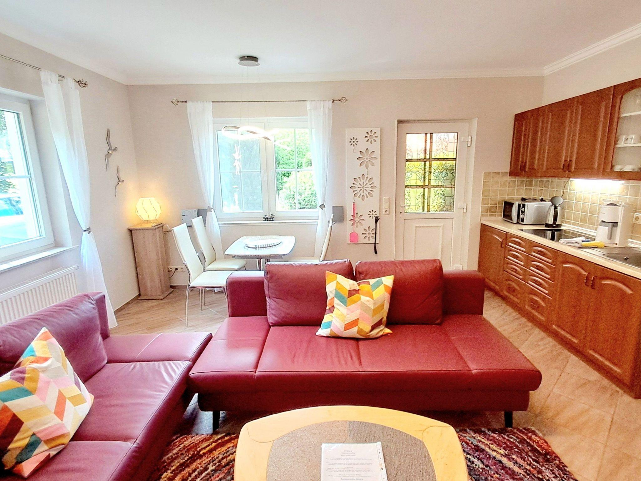 Die Wohnung bietet einen offenen Wohnbereich mit zwei bequemen Schlafcouchen (Aufbettungsmöglichkeit für 3. & 4. Person mit einer Liegefläche von 190x120cm) und einem Flat-TV. Außerdem finden Sie hier eine komplett eingerichtete Küchenzeile mit Kühl-Gefrierkombi, Cerankochfeld, Wasserkocher, Kaffeemaschine, Toaster und Mikrowelle mit Grillfunktion sowie einen Esstisch mit Stühlen für bis zu 4 Personen. Es sind maximal 4 Haustiere gegen einen Aufpreis willkommen.