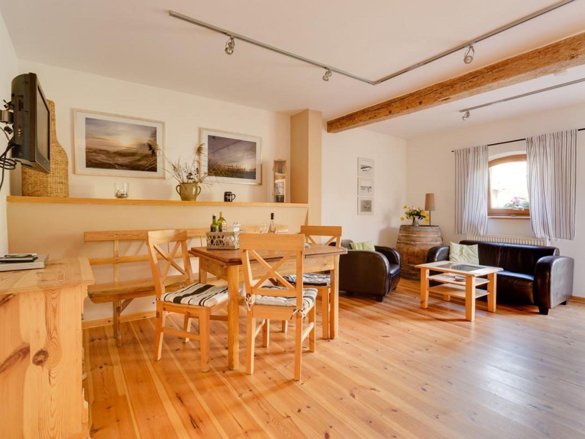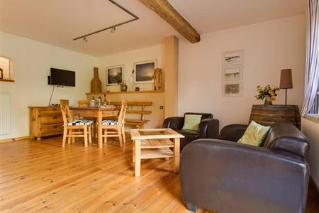 Die Wohnung Achterland im Untergeschoss ist ca. 55 m² groß und verfügt über viel Platz zum Wohlfühlen und Entspannen. Teile der Innenwände, die nach der Sanierung nicht mehr verputzt wurden, lassen Rückschlüsse auf das Alter des Gebäudes zu und vermitteln den charakteristischen Charme des Hauses. Das Wohnzimmer mit direktem Zugang zum Innenhof hat eine gemütliche Essecke, Wohnsitzecke und einen Kamin.