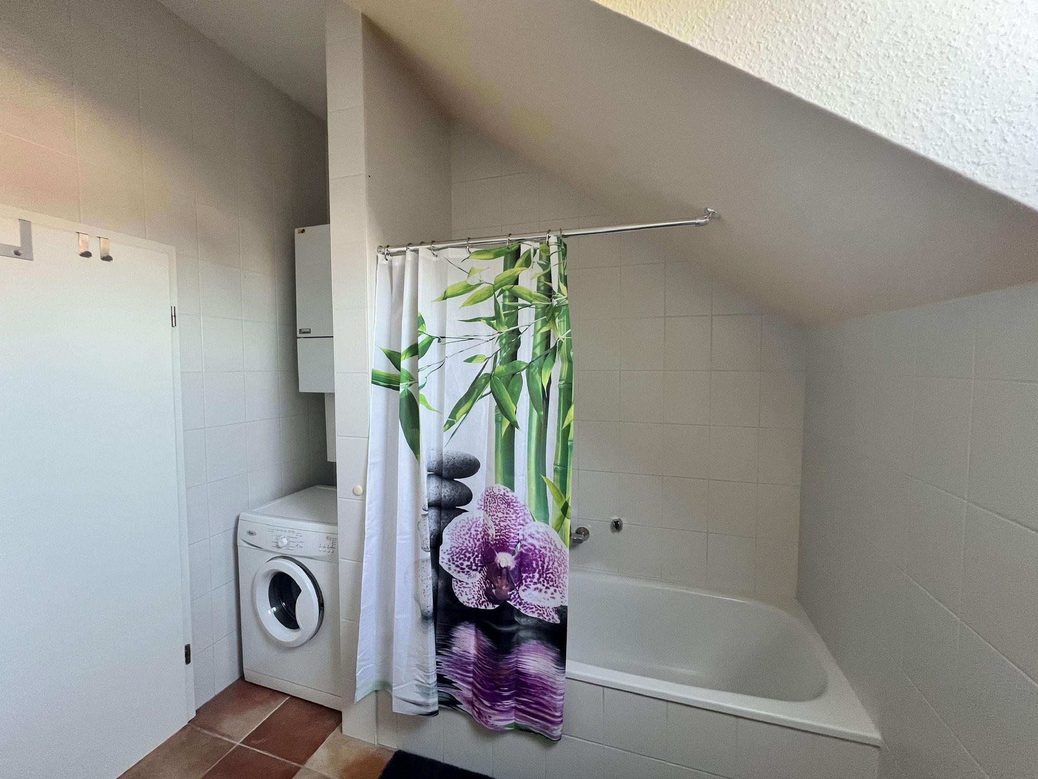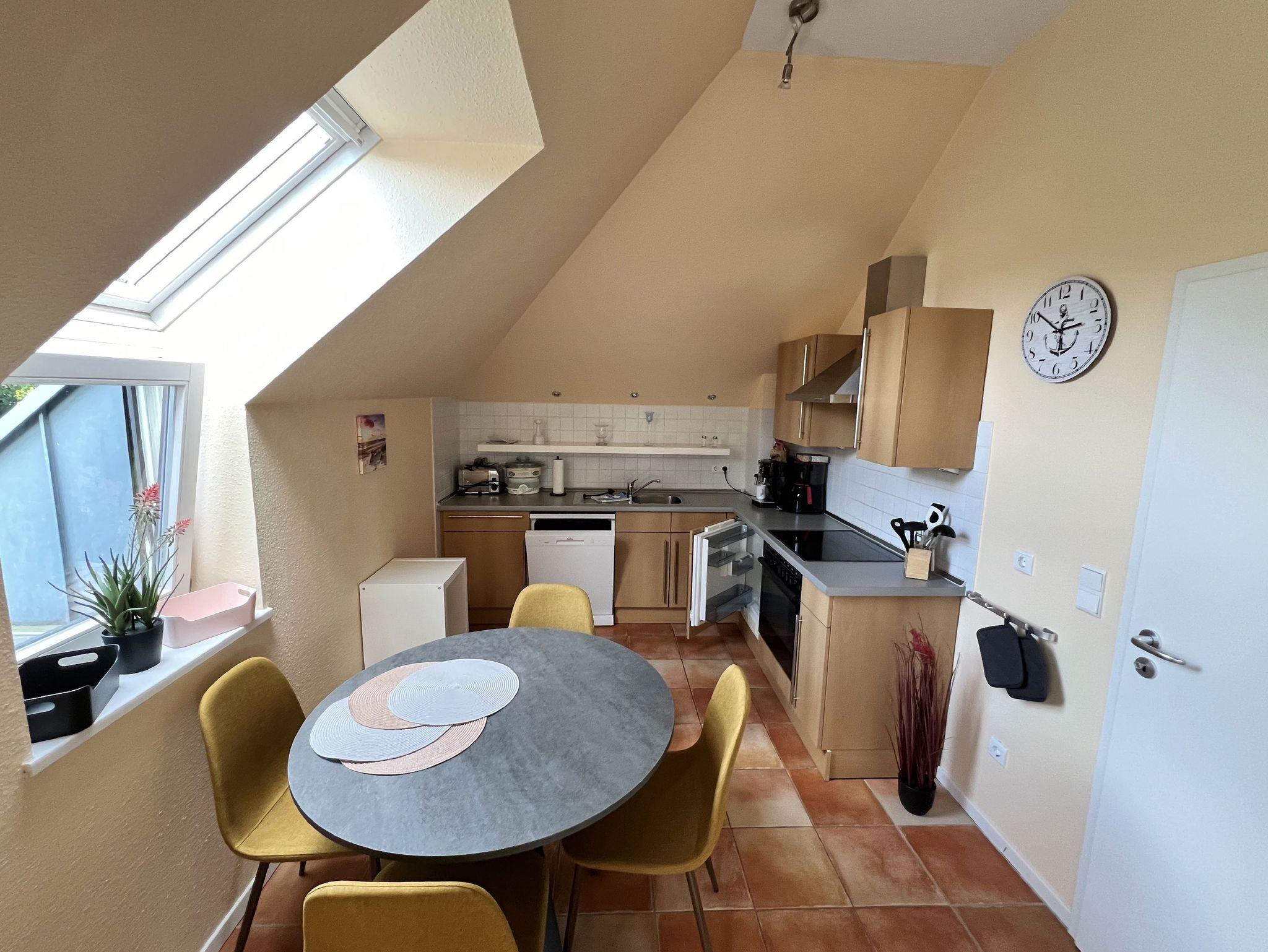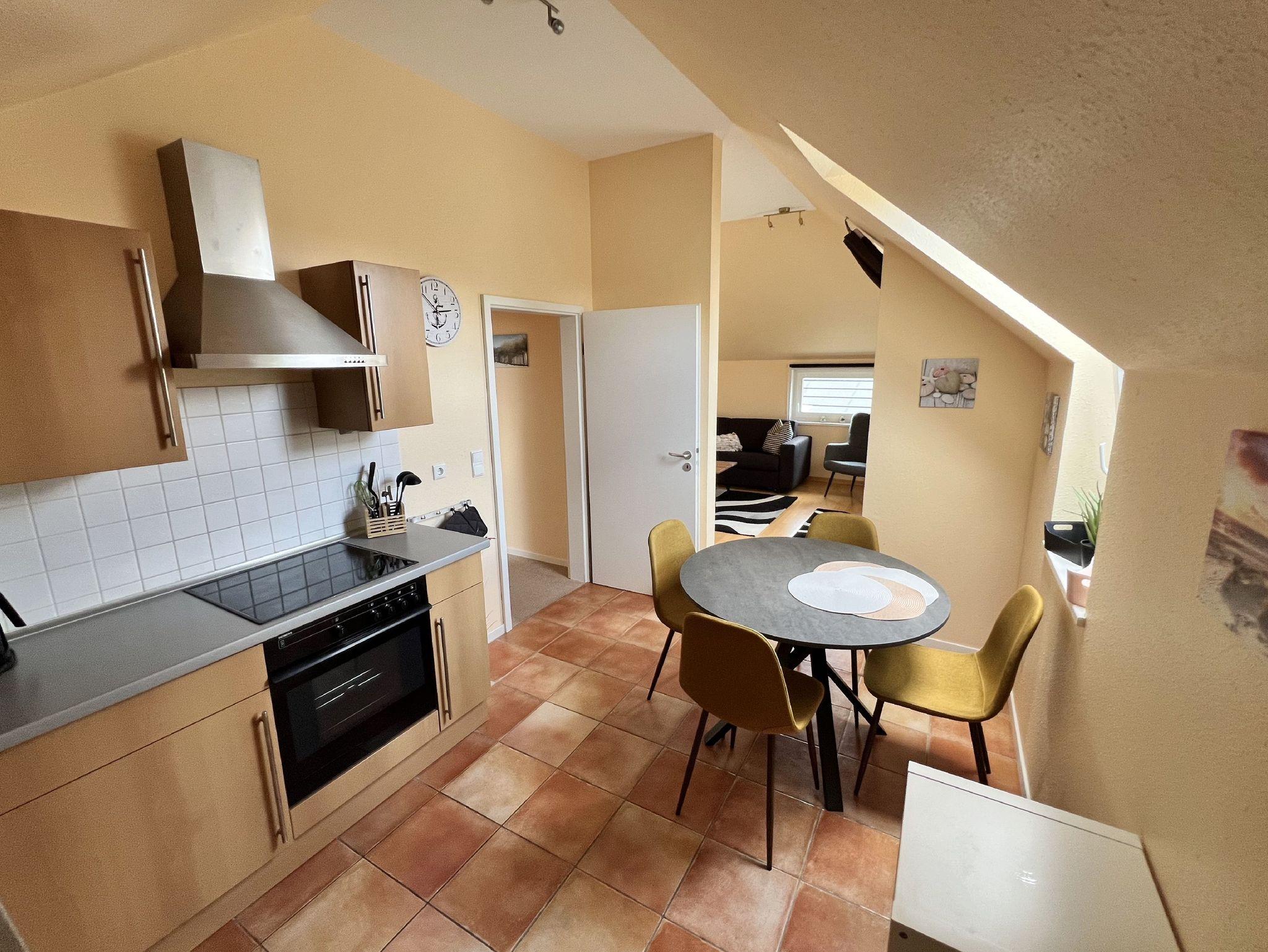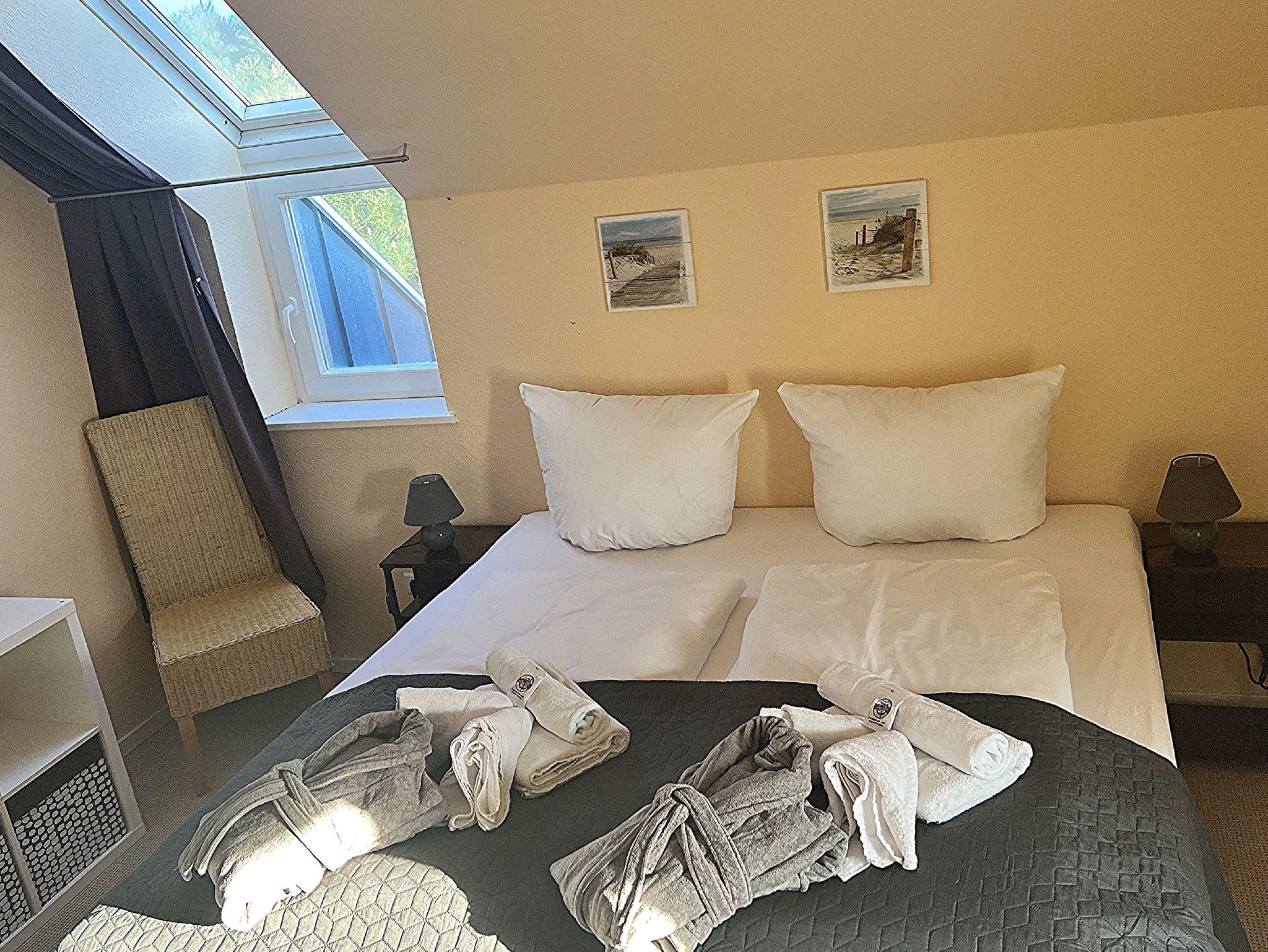 Die Ferienwohnung verfügt über ein einladendes Schlafzimmer, ausgestattet mit einem komfortablen Boxspringbett und einem Beistellbett. Das Bad ist mit einer praktischen Duschwanne und einer Waschmaschine ausgestattet. Die offene Küche lädt mit einer modernen Küchenzeile und einem Esstisch dazu ein, gemeinsame Mahlzeiten zu genießen.