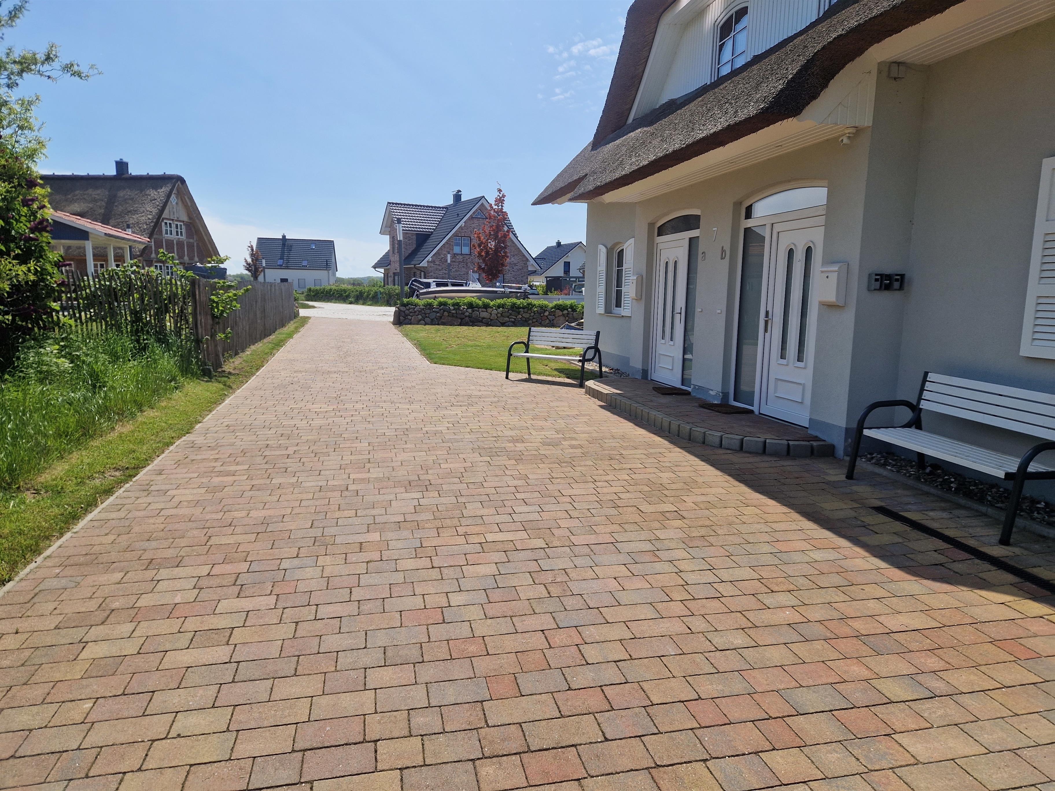 Pkw-Stellplätze stehen kostenfrei auf dem Gelände vor den Häusern zur Verfügung. Die anliegende Wiese lädt zum Verweilen, Spielen und Sonnenbaden ein.