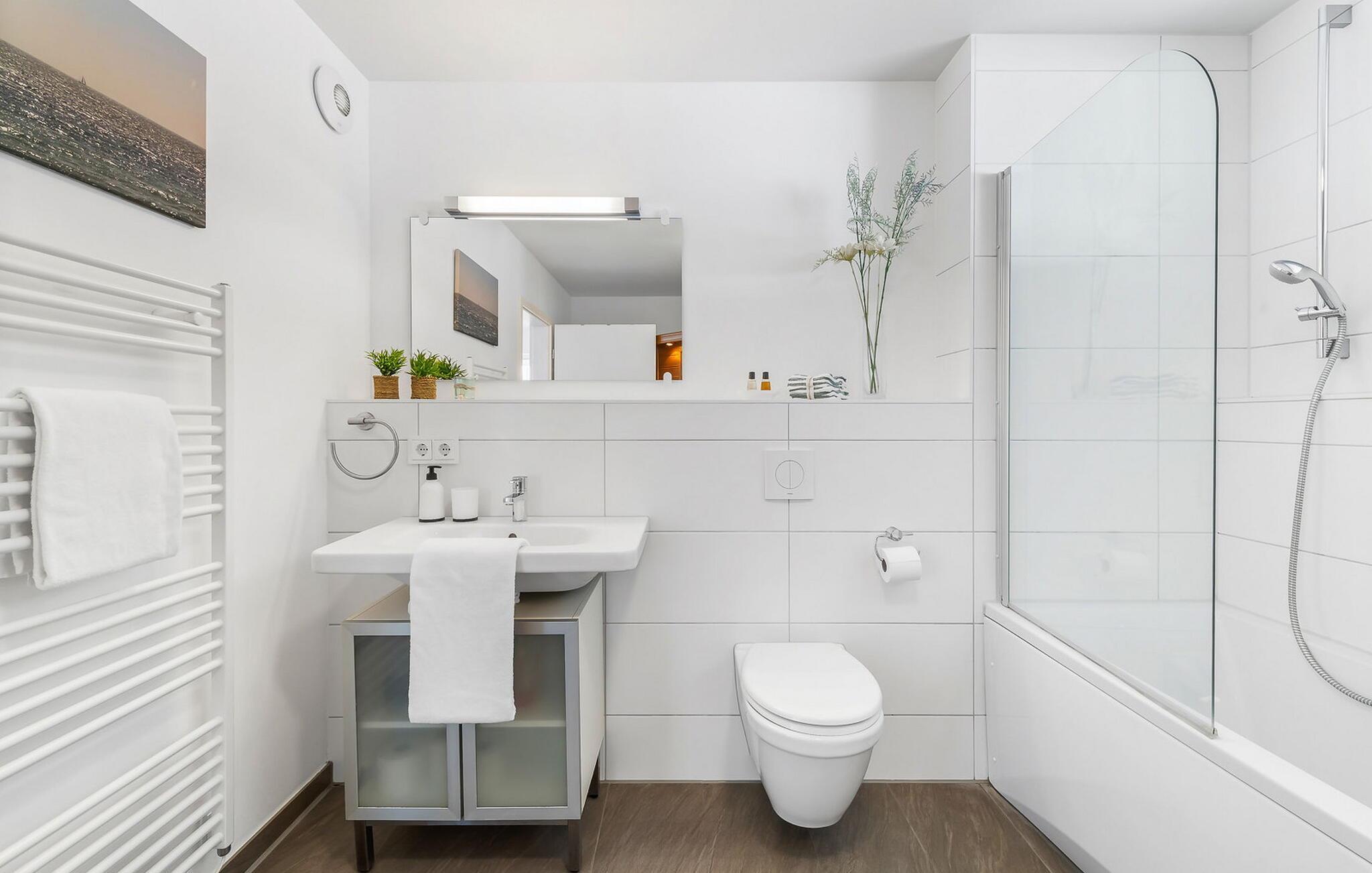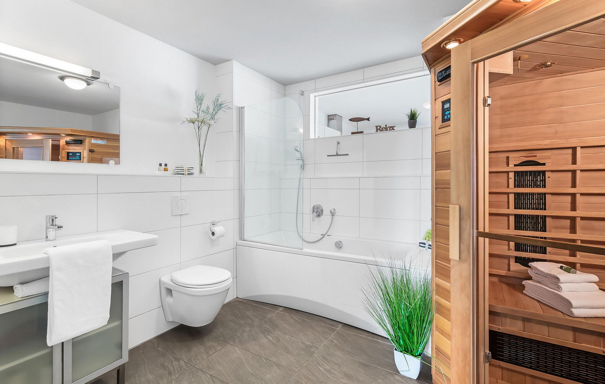 Das moderne Badezimmer ist mit einer Badewanne, die auch als Dusche genutzt werden kann, sowie für Wellnessliebhaber mit einer Infrarotkabine ausgestattet.