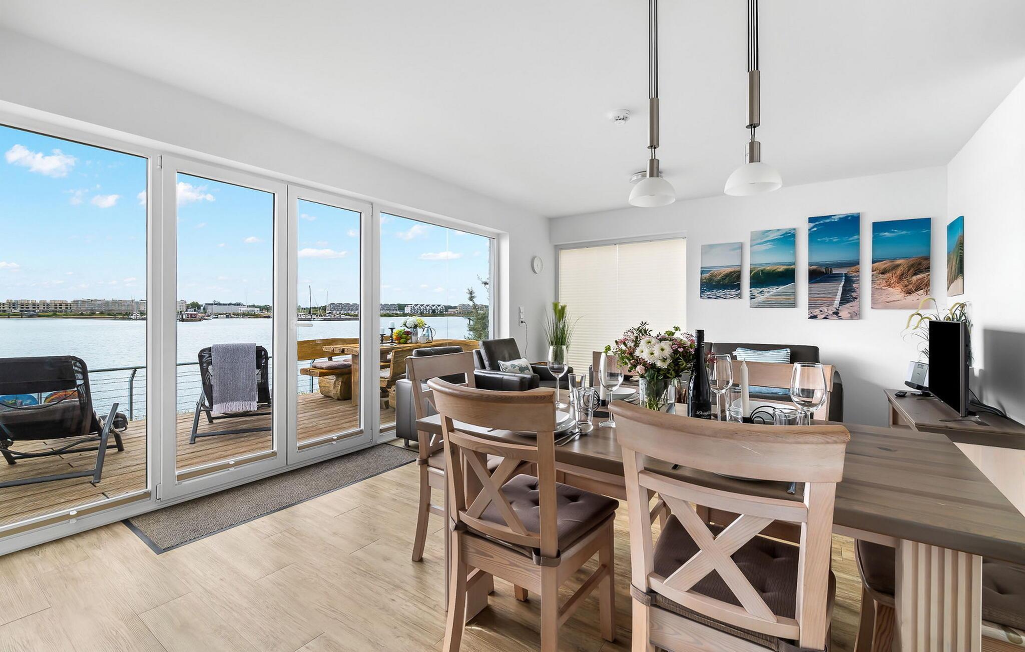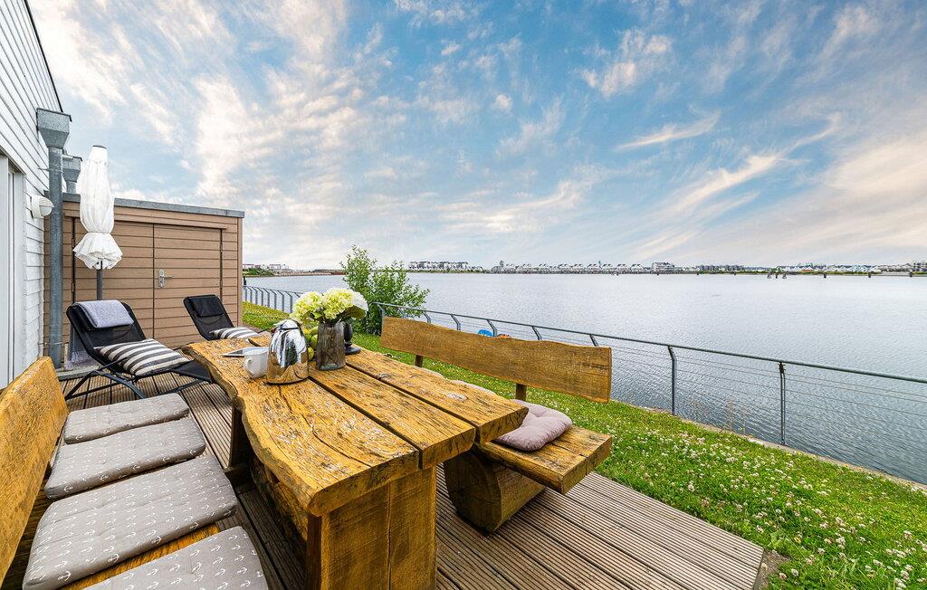 Draußen lädt eine Terrasse mit Hafenblick zum Entspannen und Genießen ein. Hier befindet sich auch ein Grill, der zu gemütlichen Abenden im Freien einlädt. Ihr Fahrzeug können Sie bequem auf dem eigenen Stellplatz direkt vor dem Haus parken.