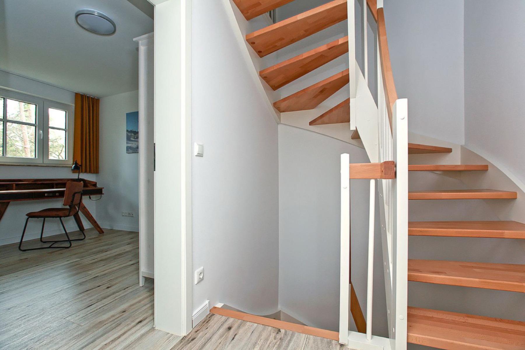 Über eine stilvolle Holztreppe gelangen Sie ins Obergeschoss. Hier erwarten Sie zwei Schlafzimmer: