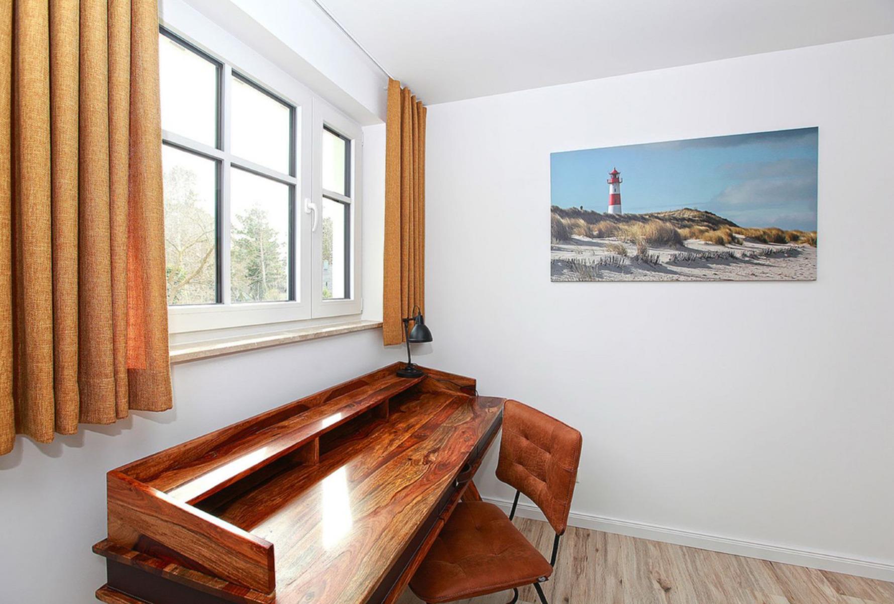 Ein Schlafzimmer mit einem Doppelbett (1,80?×?2,00 m) und einem praktischen Schreibtisch – ideal auch für ruhige Arbeitsstunden oder zum Schreiben.