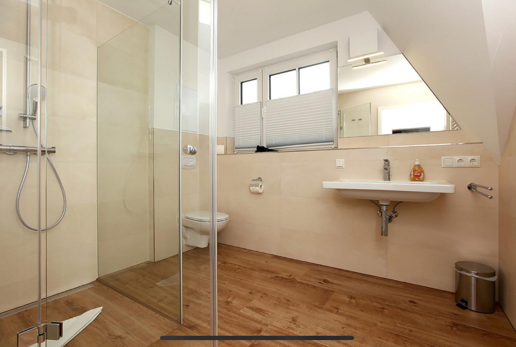 Ebenfalls im Erdgeschoss befindet sich ein Badezimmer mit ebenerdiger Dusche, WC, beheizbarem Handtuchhalter sowie einer separaten Lüftung – Komfort und Funktionalität in einem. Ein weiteres, ebenso ausgestattetes Badezimmer steht Ihnen im Obergeschoss zur Verfügung.