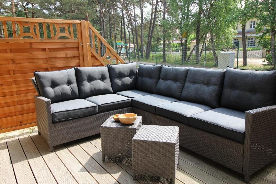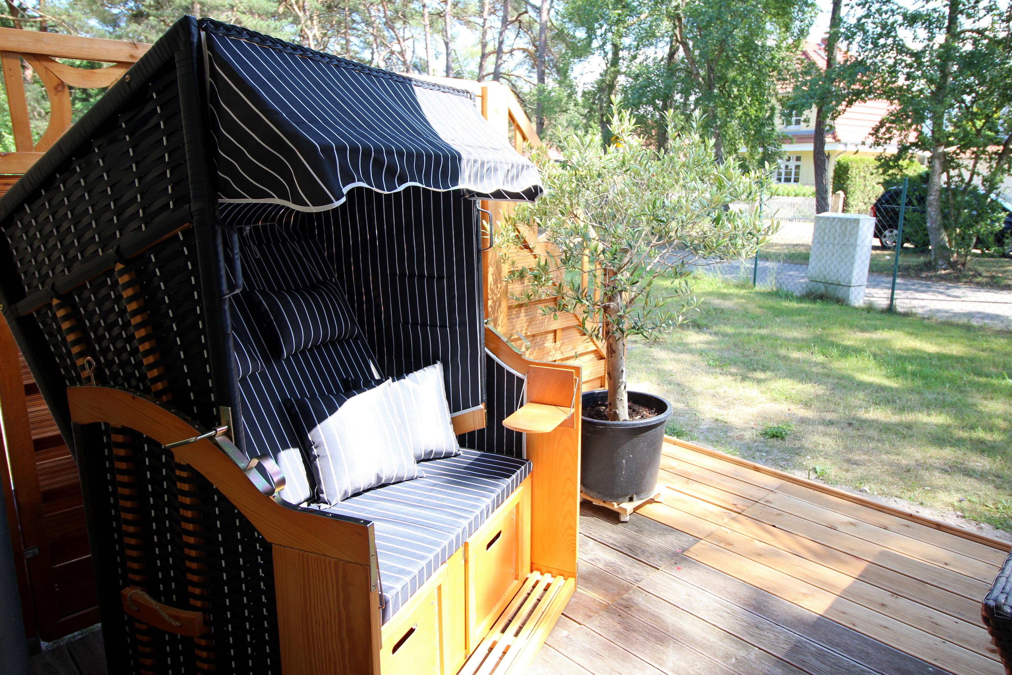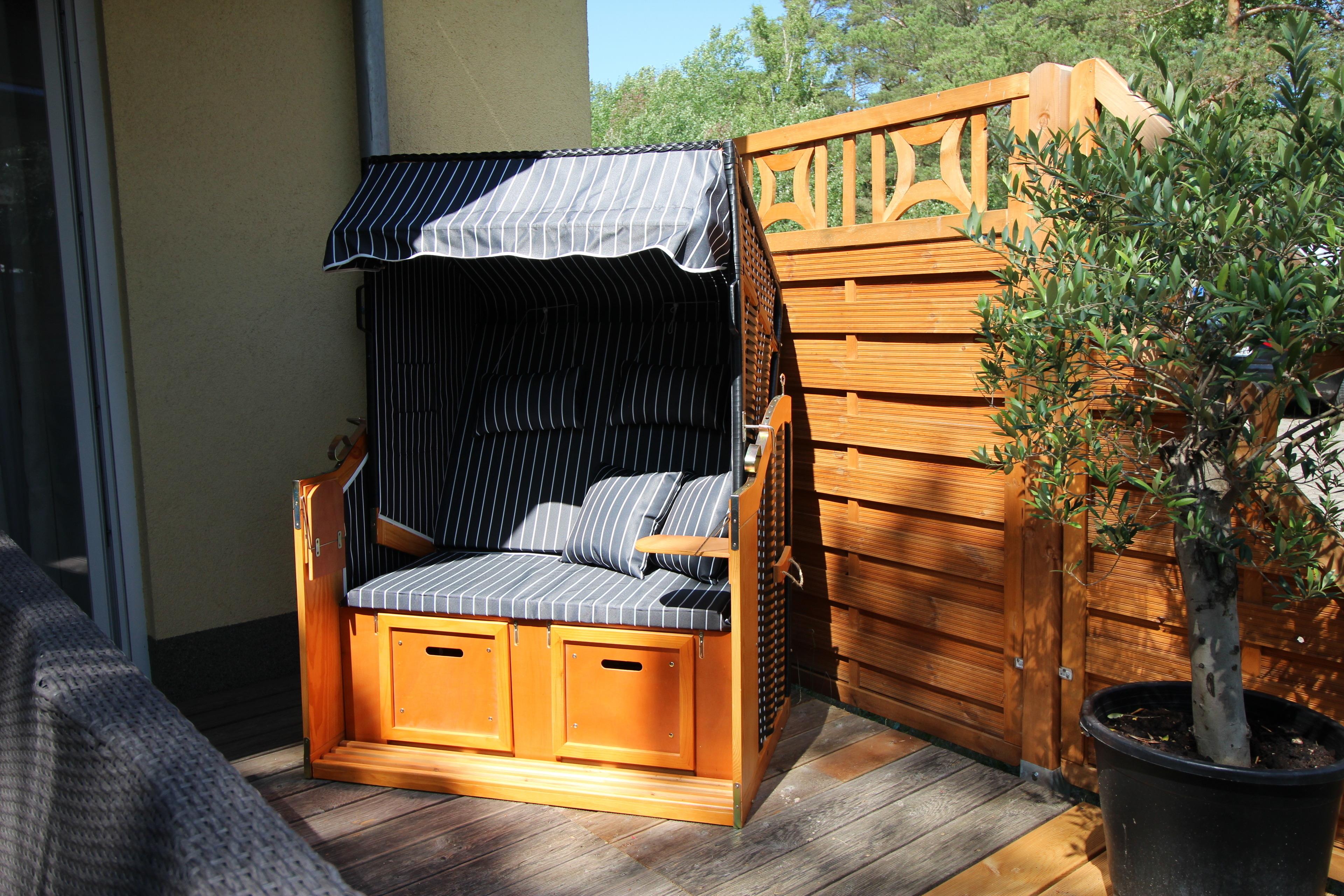 Die große Sonnenterrasse mit gemütlicher Sitzecke lädt zum Seelebaumeln ein. Die robuste und hochwertige Sitzgruppe kann man aber auch mit sehr wenigen Handgriffen zu einer Trennwand umbauen. Meist hören Sie in der Ferne das Meeresrauschen der Ostsee. Der Parkplatz befindet sich direkt vor der Terrasse, so dass Ihr Auto sicher vor Ihren Augen steht und teilweise einen Sichtschutz bietet.