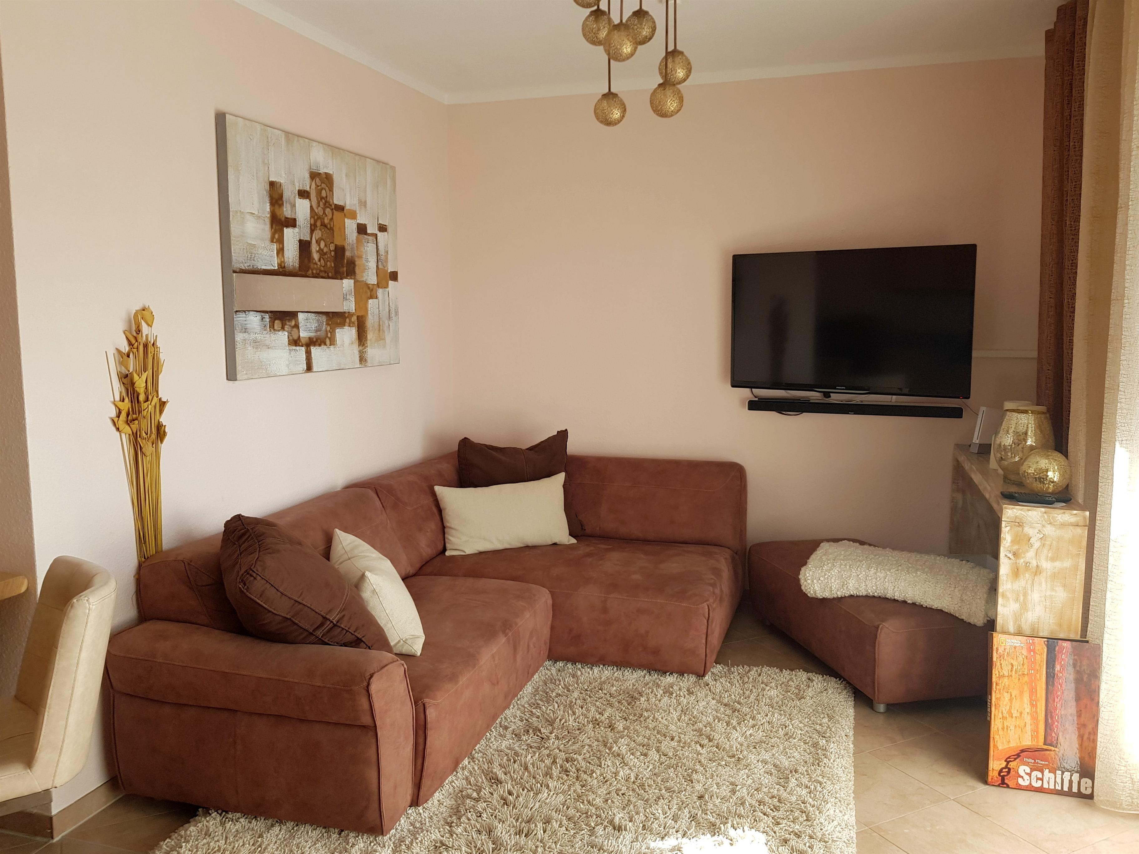 In dem gemütlich eingerichtetem Wohnzimmer stehen Ihnen ein LCD-TV, Bücher, DVD Player mit verschiedenen DVD´s und div. Spiele für Groß und Klein zur Verfügung. Auf gleicher Ebene befindet sich eine große voll ausgestattete Küche. Angrenzend befindet sich die Essecke für 4 Personen. Wohnzimmer hat bodentiefe Fenster. Von hier haben Sie einen direkten Zugang zur Terrasse . Hier können Sie einen schönen Strandtag bei einem leckeren Aperitif ausklingen lassen .