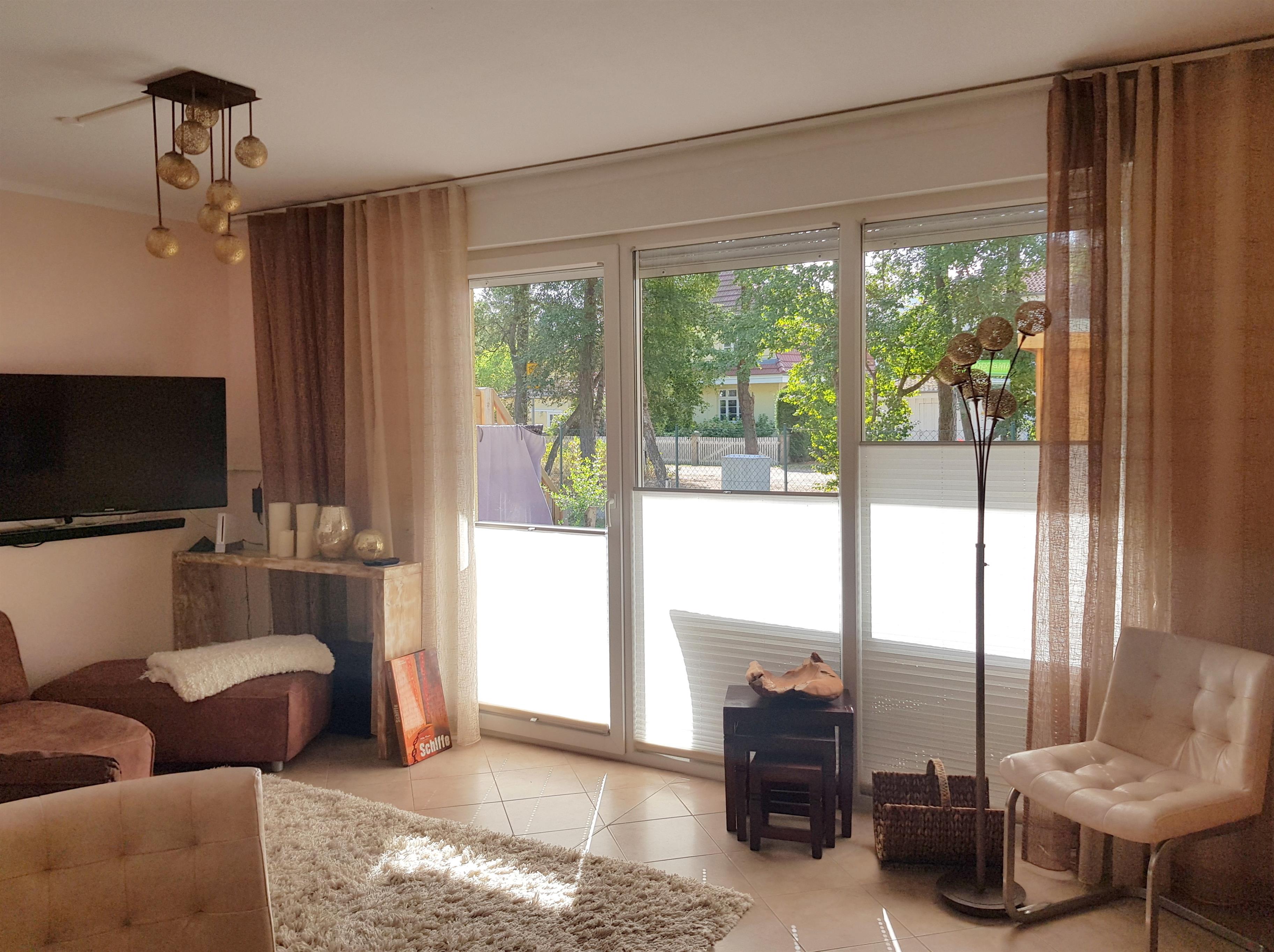 Schlafzimmer haben weiße Schutzplissees sowie Außen Rollos.