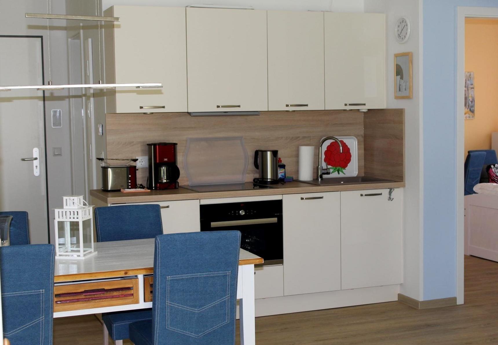 Die moderne gut ausgestattete Küchenzeile mit Kühl/Gefrierschrank,Ceranherd mit Backofen,Geschirrspüler, Wasserkocher,Toaster und Kaffeemaschine ist in dem Wohnraum integriert.Davor befindet sich der großzügige Essplatz.
