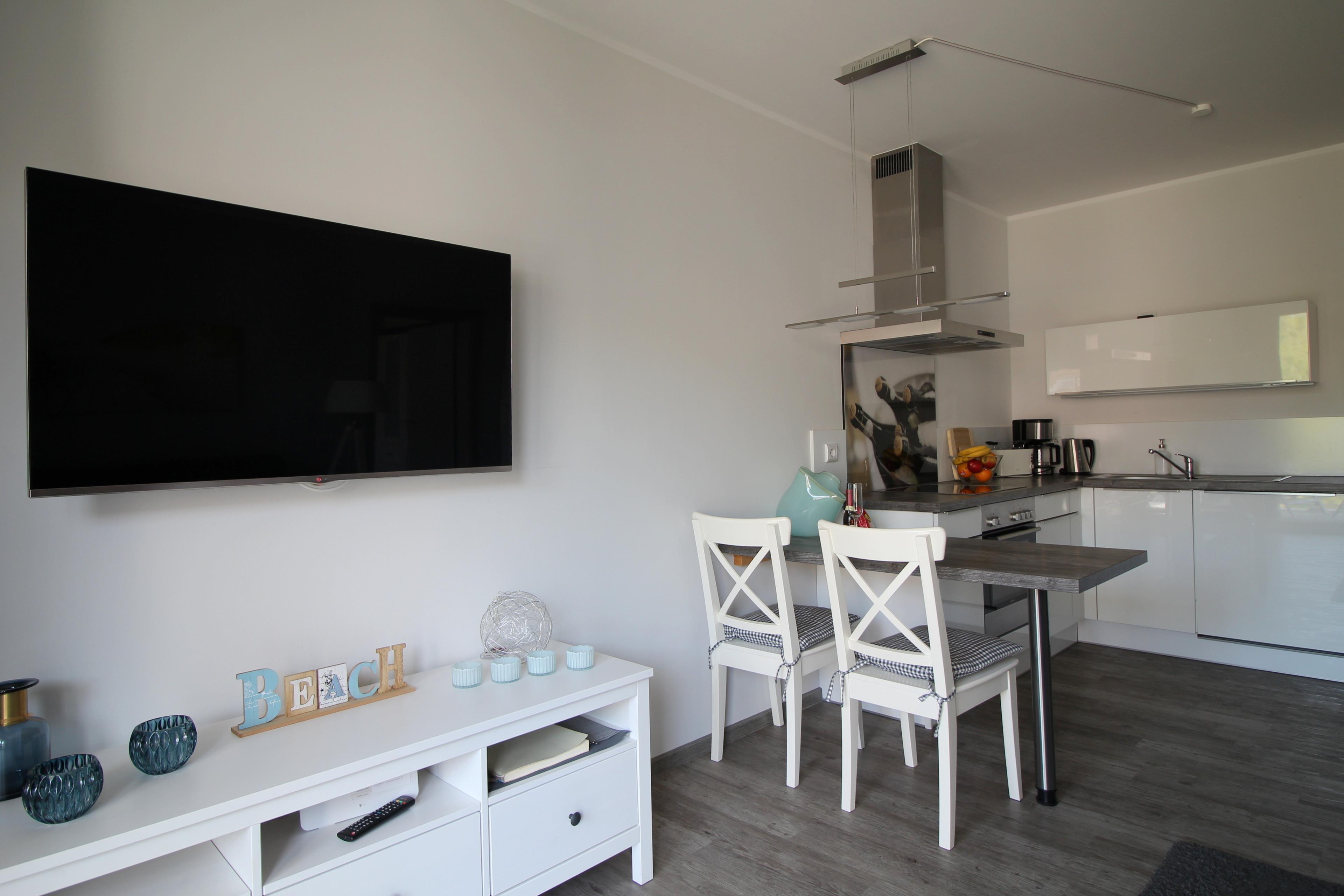 Das Appartment befindet sich im OG der im Frühjahr 2015 fertiggestellten Ferienwohnanlage "Strandläufer" in Angrenzung zu einer schon länger bestehenden Anlage. Die Ferienwohnung ist durchgängig gefliest und mit einer Fußbodenheizung ausgestattet. Die Einbauküche ist mit einem Kühlschrank mit Gefrierfach, Herd mit Cerankochfeld und Backofen und mit einem Geschirrspüler ausgestattet. Daneben sind eine Mikrowelle, eine Kaffeemaschine, ein Wasserkocher und ein Toaster sowie hochwertiges Geschirr und Besteck vorhanden. Die bequeme Eckcouch im Wohnzimmer lädt zum Entspannen ein. Weiterhin ist das Wohnzimmer mit einem großen LED-Flachbildfernseher mit Music-Sound-System und kostenloser Mediathek. Im Schlafzimmer befinden sich ein Doppelbett, sowie ein Kleiderschrank. Ein LED-Flachbildfernseher ergänzt das gemütlich und komfortabel eingerichtete Schlafzimmer. Das modern eingerichtete Bad verfügt über eine große Dusche.