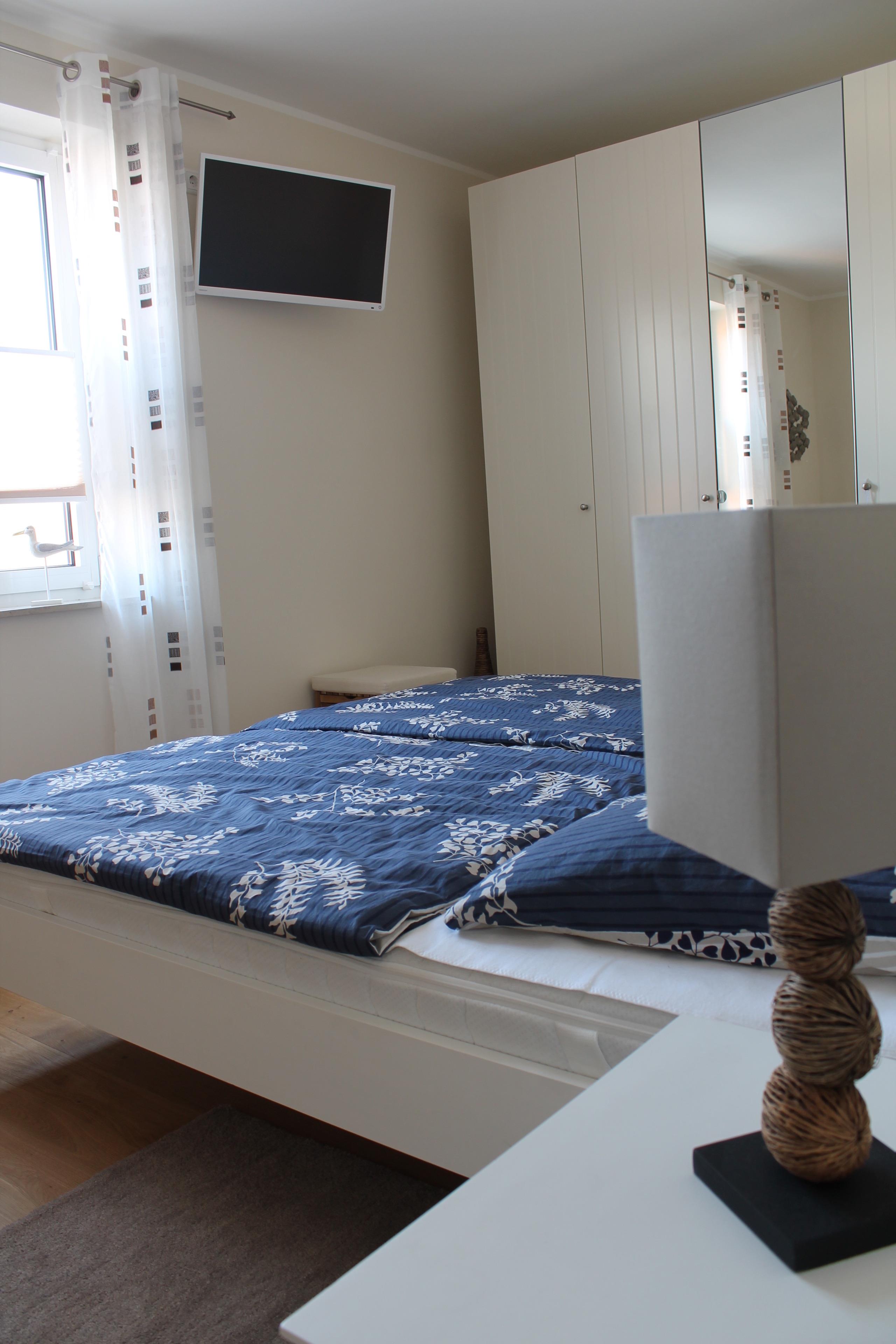 Zum Schlafzimmer gehören ein Doppelbett 180 x 200 ohne Fußbegrenzung, ein Babybett und ein TV mit DVD.