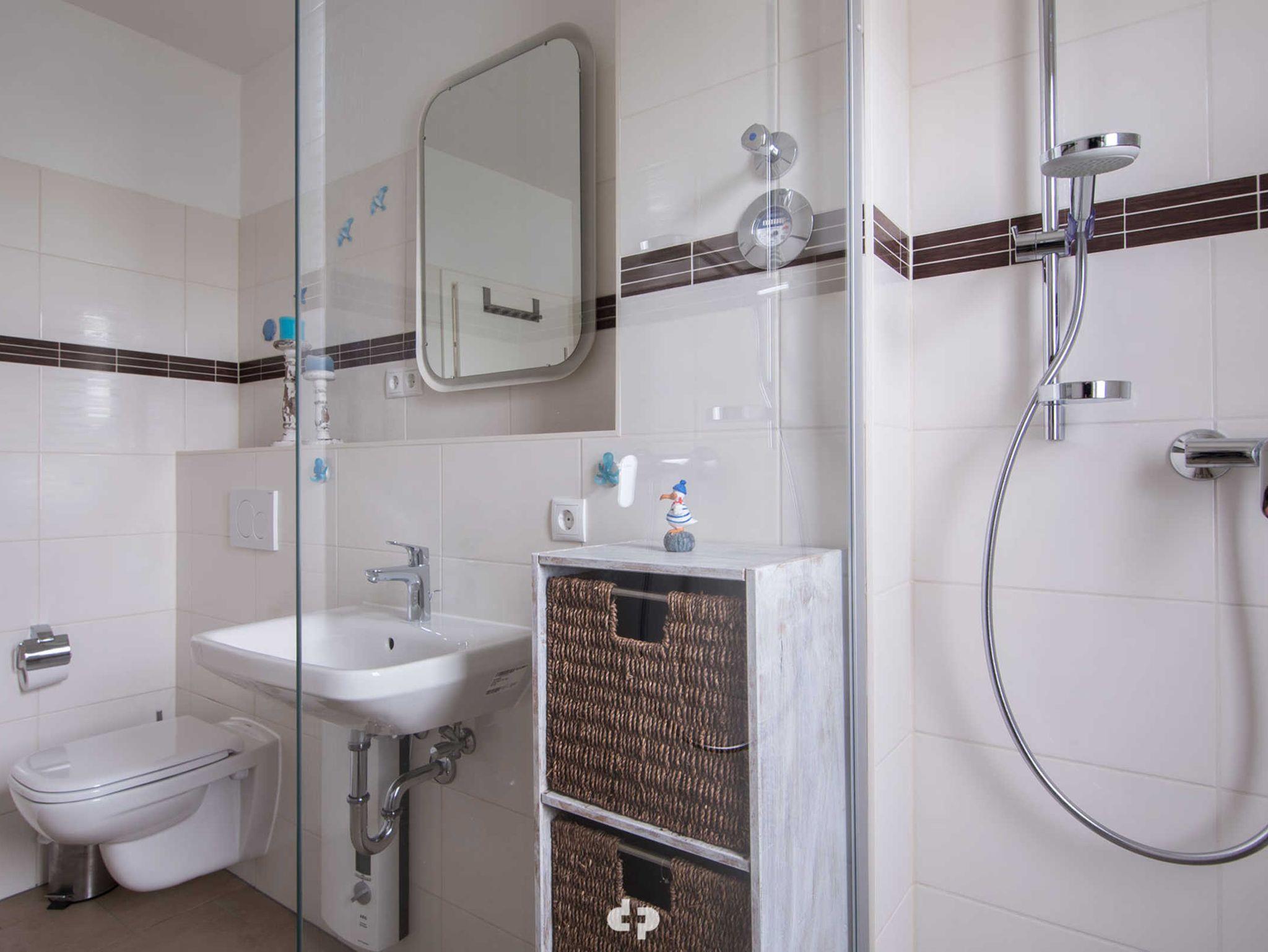 Das Appartement Nr. 5 ANKERPLATZ befindet sich im 1. Obergeschoß des Hauses 3 in der Appartementanlage Käpt n Brass. Das Appartement verfügt über 1 Schlafzimmer, ausgestattet mit einem Doppelbett (180x200) und einem 3-türigen Kleiderschrank, 1 Wohnzimmer mit integrierter Einbauküche, 1 Bad mit Dusche und Waschplatz. Im Wohnzimmer kann die Couch mit wenigen Handgriffen in ein Gästebett (180x220) verwandelt werden und bietet Platz zum Schlafen für 2 Personen.