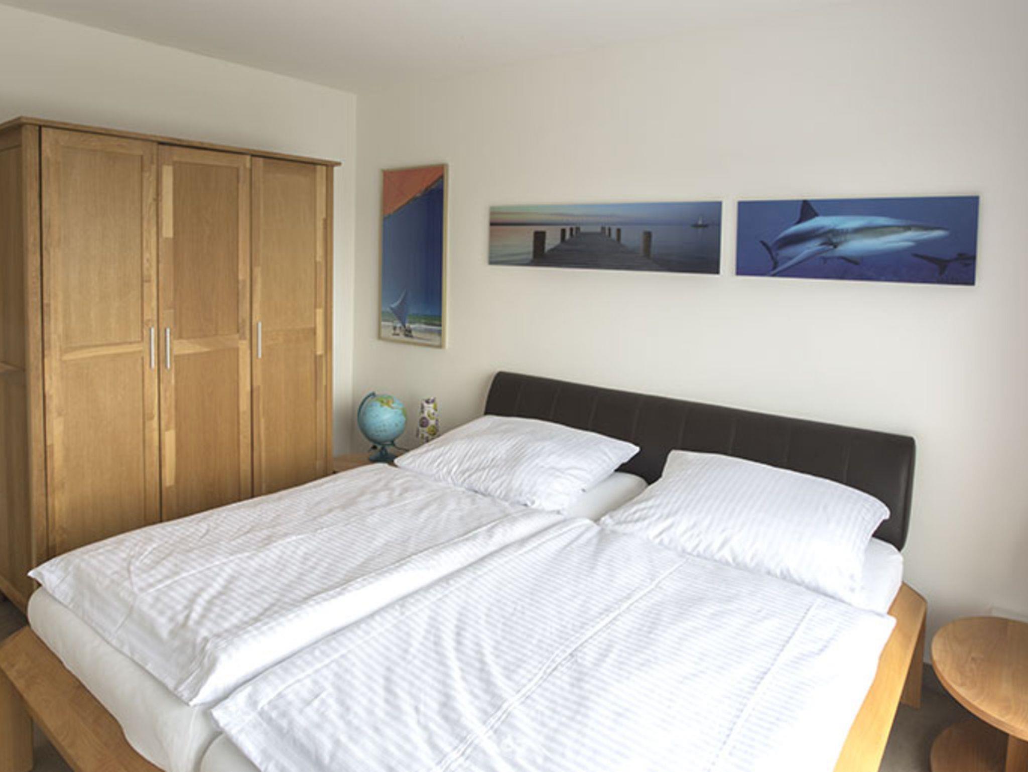 • Im Schlafzimmer befinden sich ein hochwertiges Doppelbett sowie ein 3-türiger Schlafzimmerschrank. Zusätzlich zum Doppelbett steht 1 klappbares Gästebett zur Verfügung.