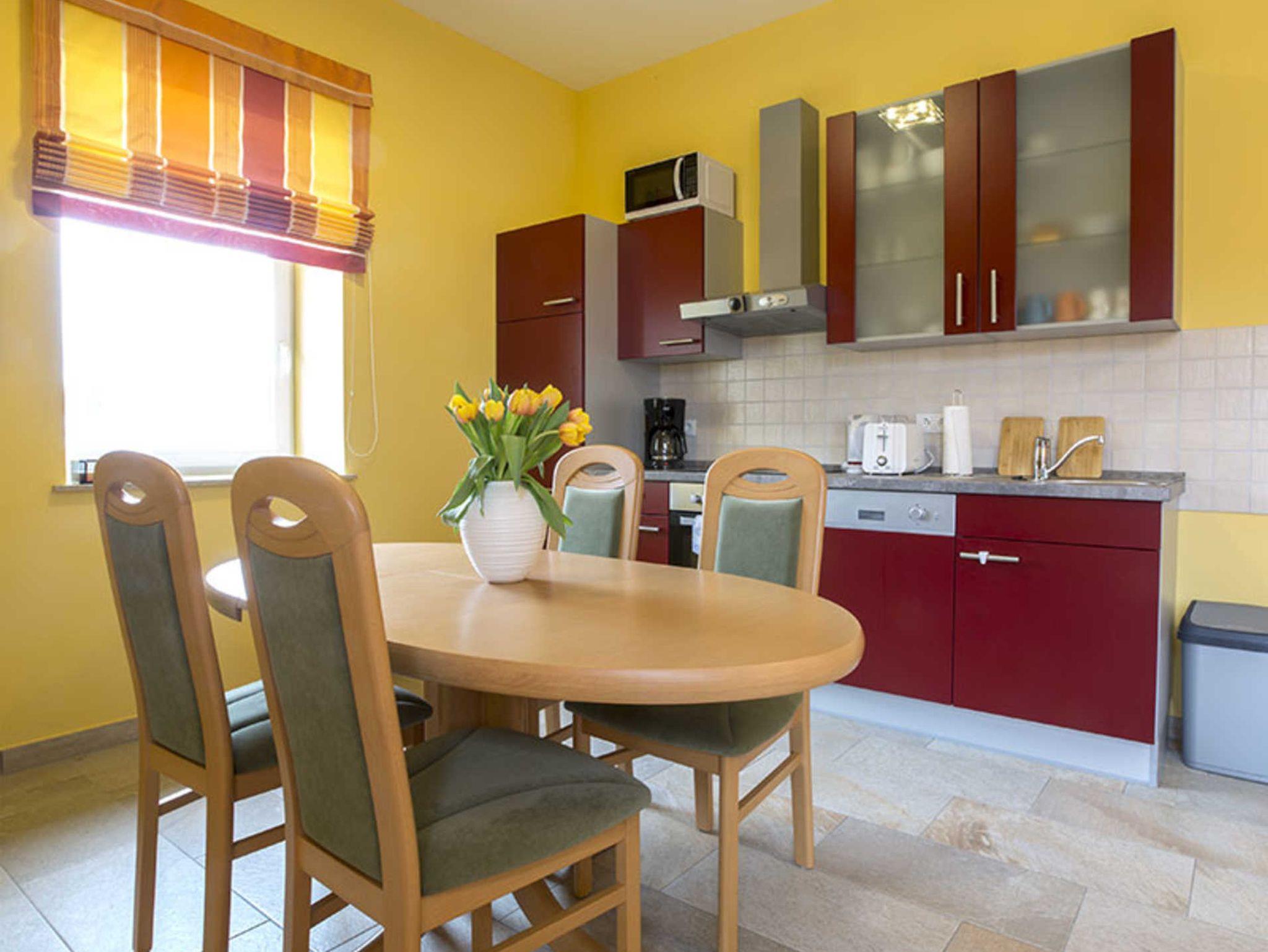 Vom großzügigen Eingangsbereich betreten Sie den Wohnbereich mit integrierter Einbauküche. Die moderne Einbauküche ist ausgestattet mit Ceranfeld, Backofen, Geschirrspüler, Kühlschrank mit Gefrierfach, Kaffeemaschine, Wasserkocher, Toaster und selbstverständlich ausreichend Geschirr und Besteck. Am Esstisch können bequem 4 Personen Platz nehmen.