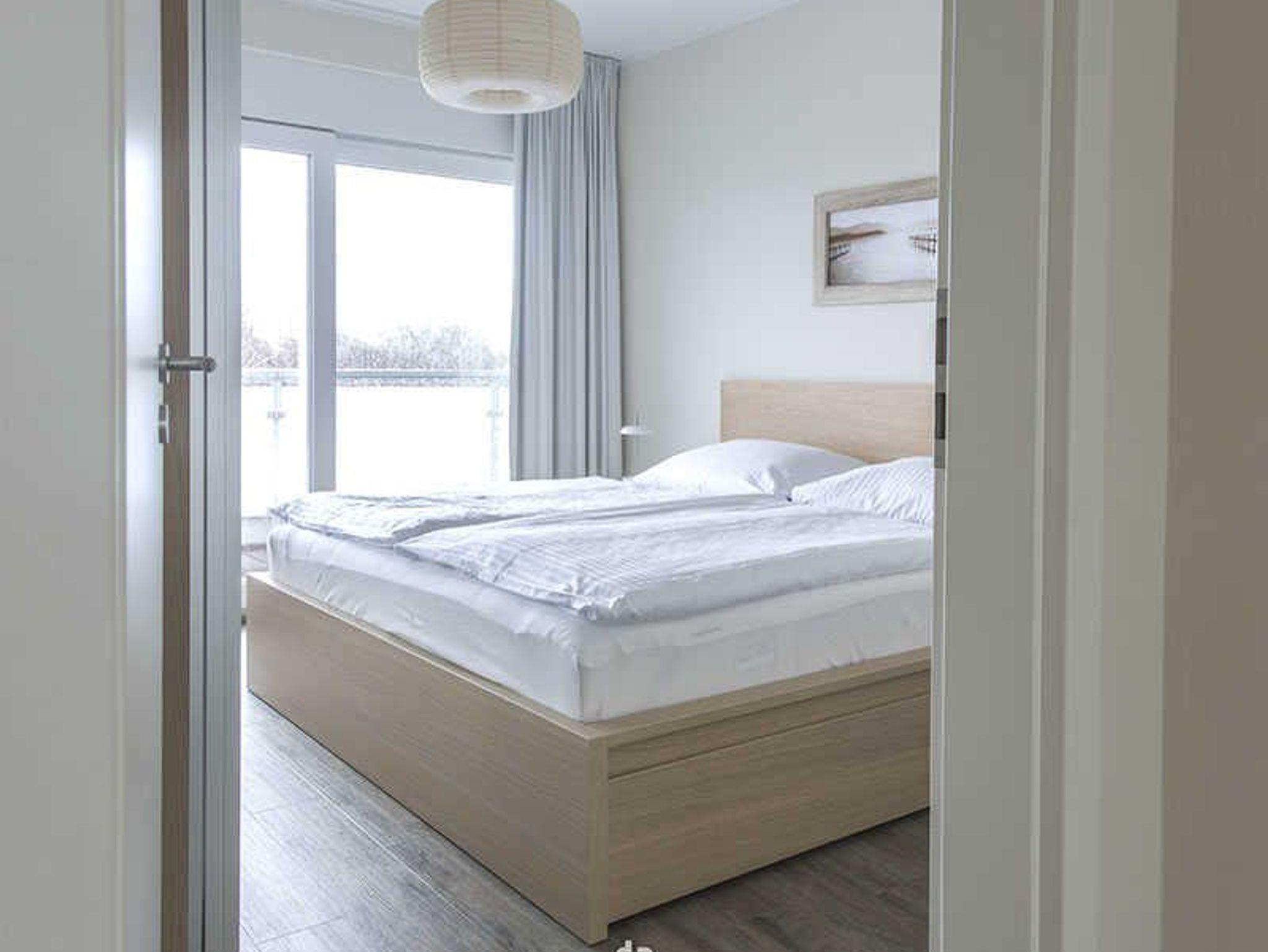 • Im Schlafzimmer befinden sich ein Doppelbett (eine 180 x 200 große Matratze) sowie ein großer Schwebetürenschrank mit viel Stauraum.